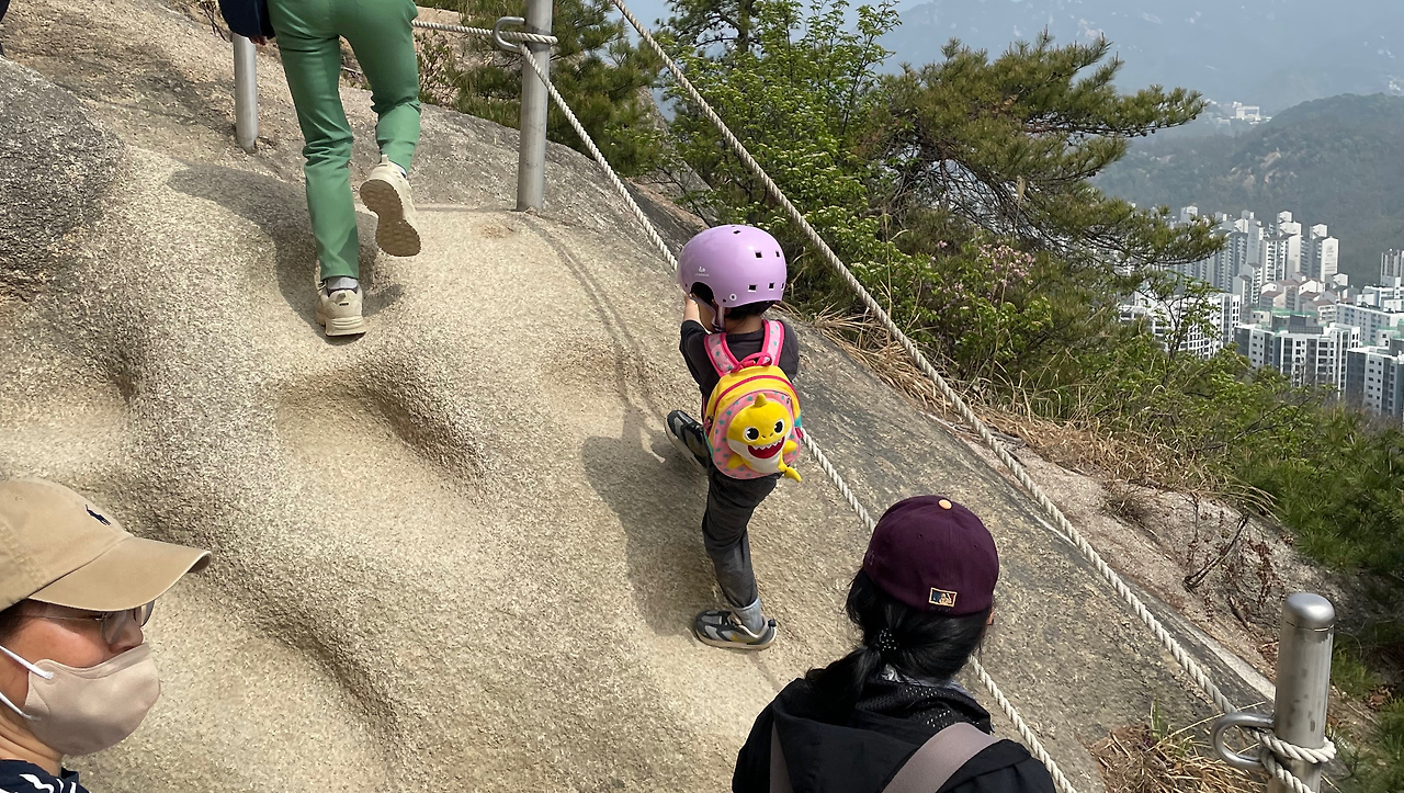 아이랑 지난 2년간 다양한 산을 경험했는데, 우면산이나 인왕산등 거친 산은 아이의 도전 정신을 자극할 수 있어 좋았다. 개인적으로 서울 내에서 가장 추천하는 산은 안산이다. 안산은 정상 봉수대까지 높지 않으면서 데크길, 계단길, 돌길, 숲길 등 코스가 다양해서 지루하지 않다. 특히 돌길이 쭈욱 나오는 암벽을 좋아하는데, 스파이더맨이라며 다람쥐처럼 네발로 기어 올라간다.