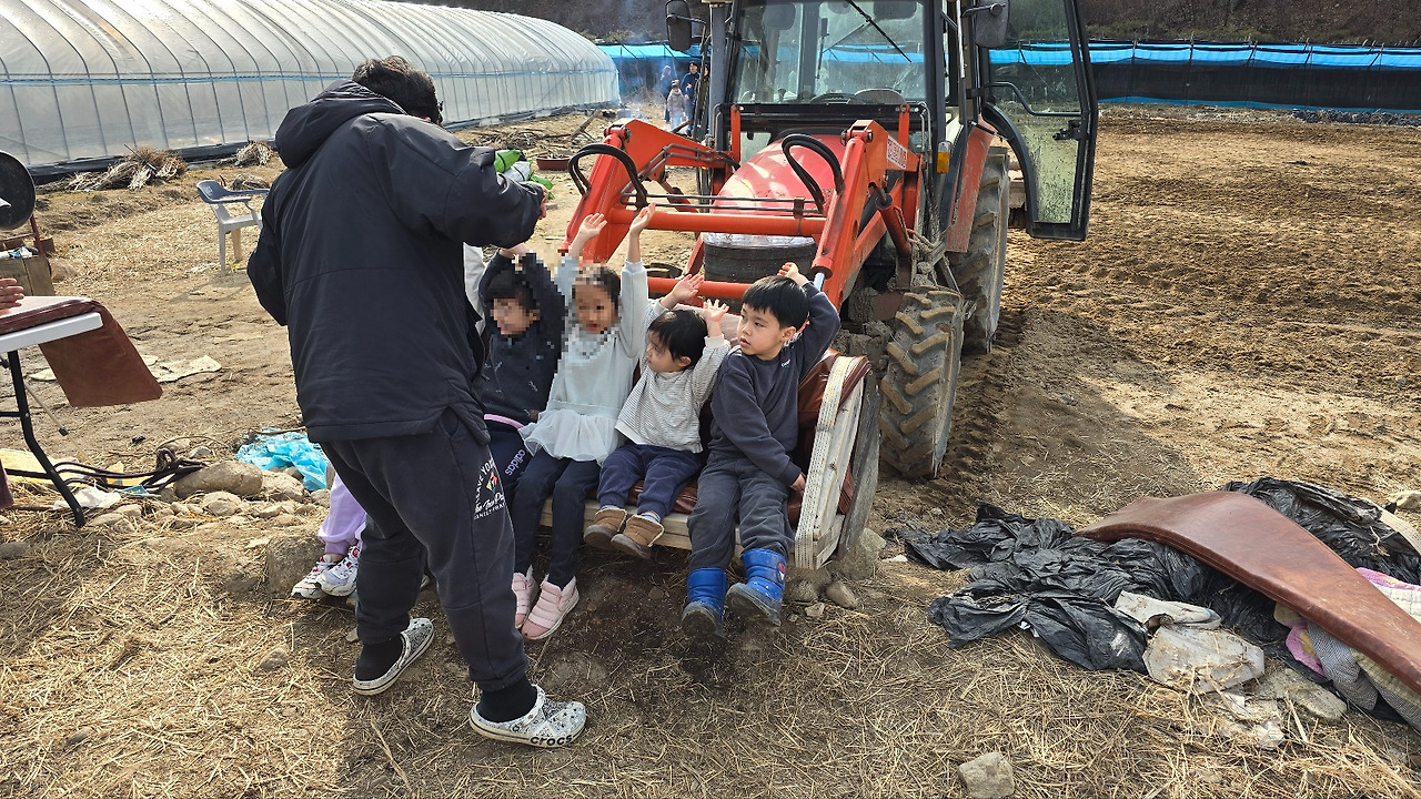 출발 전엔 10명 정도만 있을 거란 예상과는 달리 4인 가족 기준 24팀 정도 사람들이 있었다. 계산해 보니 약 100여 명. 이 팀은 4시에 하산하는 팀이고, 8시 하산팀과 1박 팀은 따로 그룹을 지어 체험을 하고 있었다. 예약 사이트에는 "농촌의 지저분함과 불편함이 있습니다"라고 적어놨는데도, 아파트와 쇼핑몰에 익숙한 대한민국 사람들이 농촌 체험에 이렇게 진심이라니. 얼음 미끄럼틀, 트렉터 타기, 모닥불에 군밤굽기등 한시간 단위로 빽빽 짜여진 스케쥴에 아이들은 열광했다.