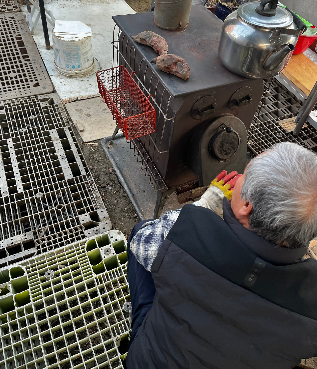 본가 뒤에 하우스를 크게 하나 짓고, 안에 난로를 하나 설치했다. 두 분은 오후 산책을 하고 돌아오는 길에 땔감용 나무, 가로수 정비 사업을 하고 남겨 놓은 나무를 하나씩 끌면서 집으로 간다. 큰 나무를 도끼와 톱으로 잘라서 땔감을 만들고, 난로에 불을 피워 고구마며, 밤이며 구워 먹는다. 그 위에는 스테인리스 주전자를 올려놓고 물을 끓이며, 친구들이 방문하면 그 물로 믹스 커피도 타서 대접하시면서 올 겨울을 보내셨다.