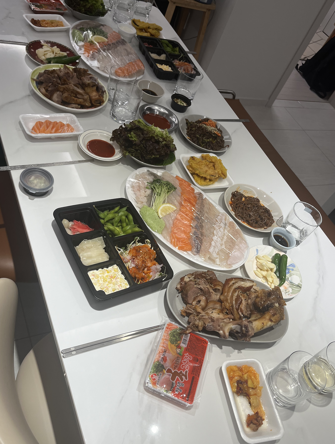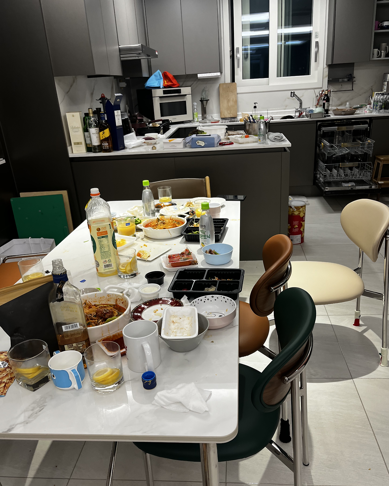 집 안에서는 매운탕의 비린내가 진동을 하고 있고, 바닥에는 온갖 과자 부스러기가 떨어져 있다. 음식물과 배달음식과 함께 온 일회용을 치우고, 쓸고, 닦고, 설거지를 했다. 음식물 쓰레기봉투 3L짜리 두 개를 꽉꽉 채우고, 식세기를 두 번째 돌렸다. 온몸에서 나는 매운탕 비린내를 씻어내는 샤워를 끝으로 남편의 집들이는 정말로 끝났다.