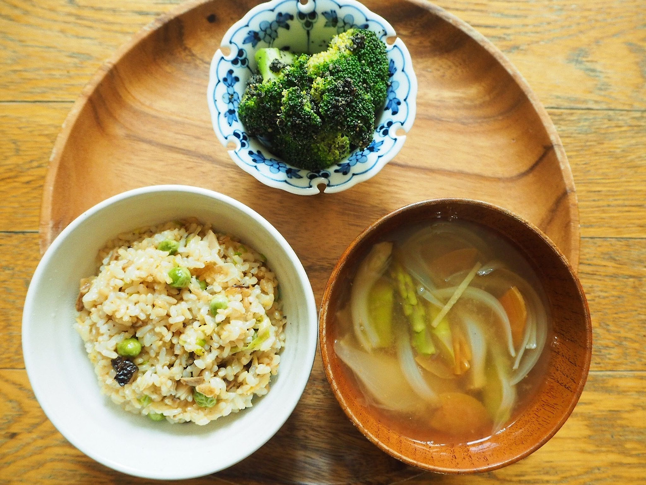 반가운 손님, 완두를 표고버섯과 함께 중화풍으로 볶아 고명을 만들고 밥에 섞었다. 4월에 특히 맛있는 아스파라거스로는 된장국을 끓이고 생강으로 알싸한 향을 더하니 늘 먹는 된장국이라도 새롭다.