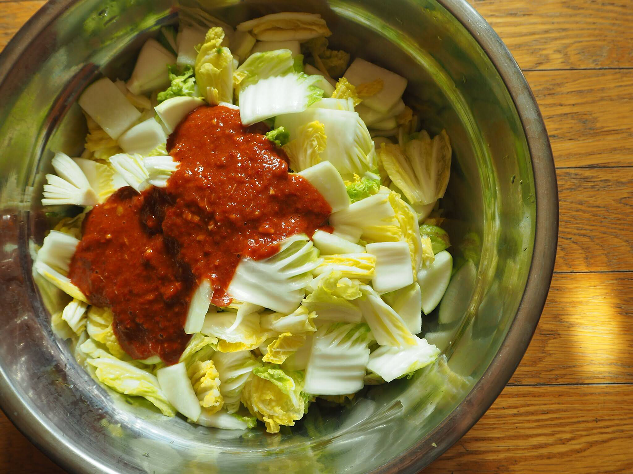 요즘 새로운 취미는 김치 담그기. 김치로 만들면 더 맛있는 애들을 먹는 계절이 왔으니 담가 주어야 한다. 맛있게 먹을 만큼만 담그고 너무 시어지기 전에 다 먹는것이 내 스타일. 이번에는 무와 배추를 썰어 슥슥 버무리는 막김치. 이번달 리마 사범수업중 한가지가 마크로비오틱 한국음식 수업이라길래, 다함께 먹으려고 넉넉하게 만들었다. 일본에서 수업을 들으며 동기분들한테 김치를 먹고 싶은데, 시판김치에는 젓갈이나 설탕이 들어가있어서 사먹지도 못하고 만드는 방법도 모른다는 이야기를 많이 들어왔다. 생각해보면 정말 난감한 상황. 이런 동기들에게 설탕한톨 넣지 않고 식물성 재료로만 만든, 심지어 계절을 이해하며 만든 마크로비오틱 김치 맛을 알려주고 싶었다.