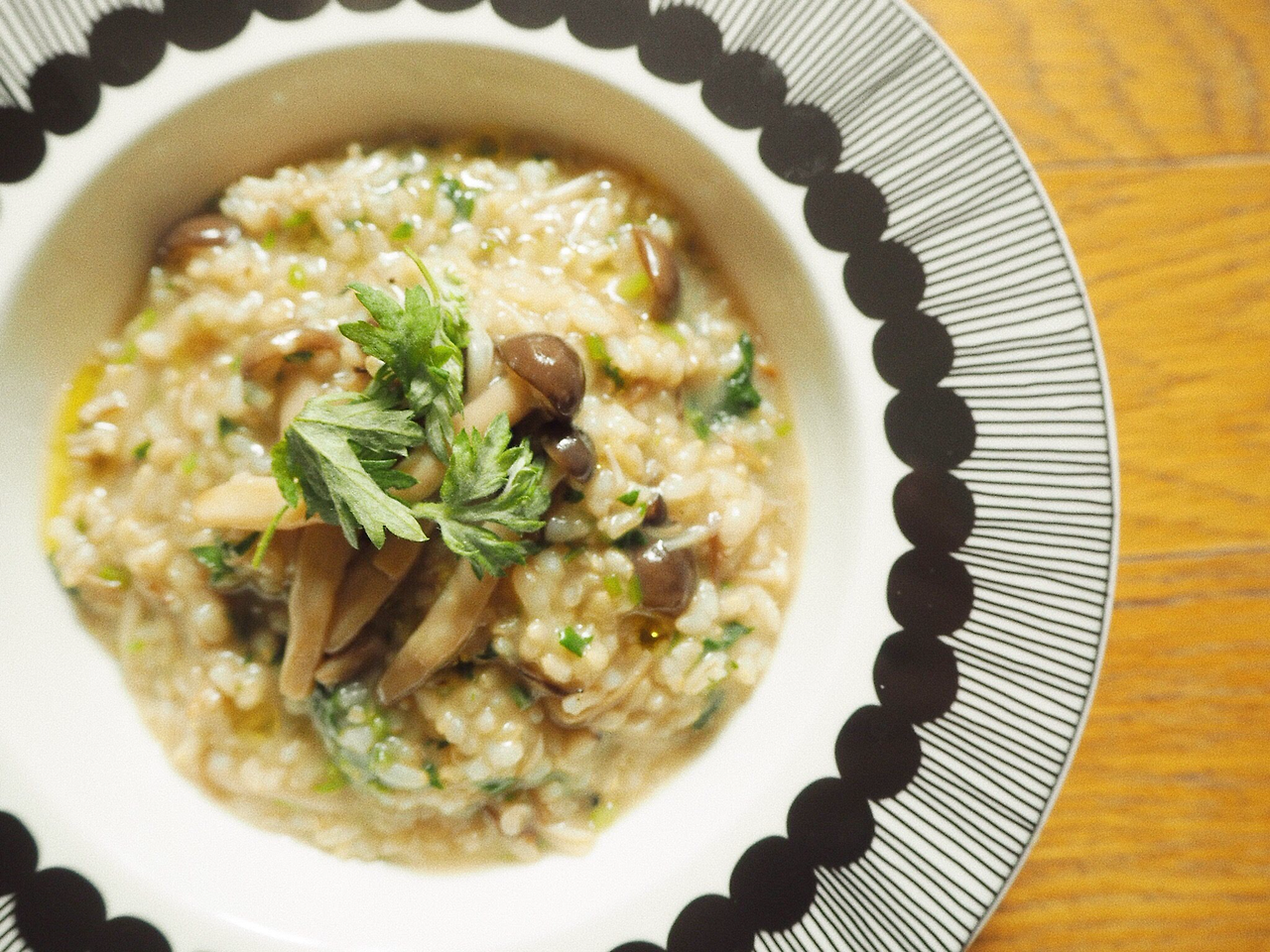 하지만 향이 조금 덜하면 어떤가. 나에게 주어진 쑥을 마음껏 즐겨보려 한다. 남은 쑥은 버섯과 함께 현미 리조또가 되었다. 덕분에 오랜만에 서양풍의 음식을 먹었다. 동물성 재료 하나 없이 어느집에나 있을 법한 재료들로 차려보는 리조또. 내가 만들었지만 참 맛있다.