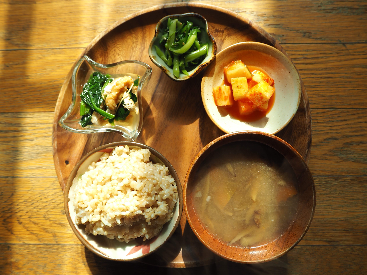 세달간의 팝업식당, 쿠킹클래스 운영에 쉼표를 찍었다. 여느때와 다름없이 월요일은 남은 재료,반찬들로 차려보는 밥상. 수업때 함께 만든 뿌리채소 된장국, 식당메뉴로 등장했던 생강국물에 재운 시금치와 유부, 미나리 깍두기, 미리 만들어둔 미나리 나물까지. 상수동으로 출장가있던 그릇들도 돌아왔다.