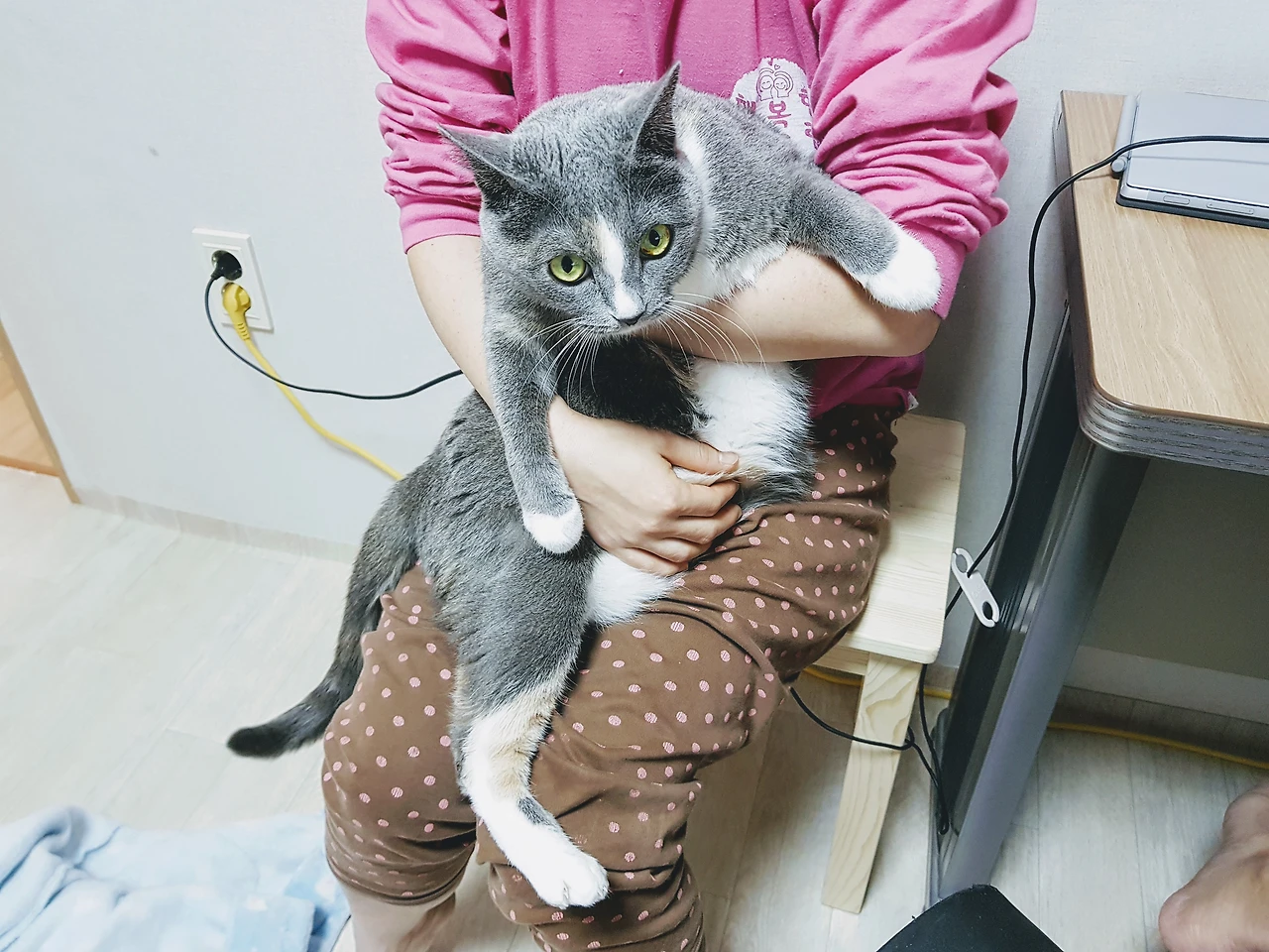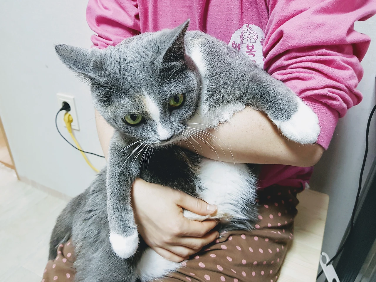 고양이가 싫어하는 건 하지 말자는 주의라 거의 안을 기회가 없지만 보통 문 열 때 탈출할 때가 있습니다. 그럴때면 후다닥 달려가서 탈주한 퓨리를 안아서 데려옵니다. 아니면 밖에 나가고 싶어할 때 미리 안아서 아주 잠깐 외출(?)을 다녀온답니다.
