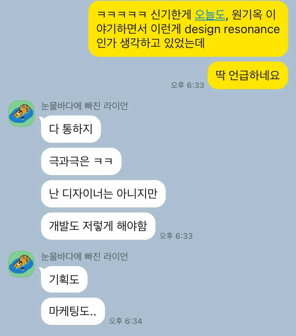 개인적인 믿음일 수도 있지만, 디자인이든, 개발이든, 비즈니스든 변하지 않는 건, 내가 만든 무언가로 누군가에게 특별한 감정을 전달하고자 하는 마음은 모든 업이 똑같다. 그렇기 때문에 누군가에게 특별한 감정(혹은 감동)을 전달하고자 한다면 어떤 메시지나 비전에 ’공감‘하는 사람들(팀원)끼리 에너지를 응축시킨 다음 모으고 모아서 한 방을 던져야 한다. 그러면 우리의 마음이 고스란히 전달된다. 공명(resonance)이 발생할 수밖에 없다. 오늘 대화 중에 나는 이걸 원기옥 같다고 표현했다.