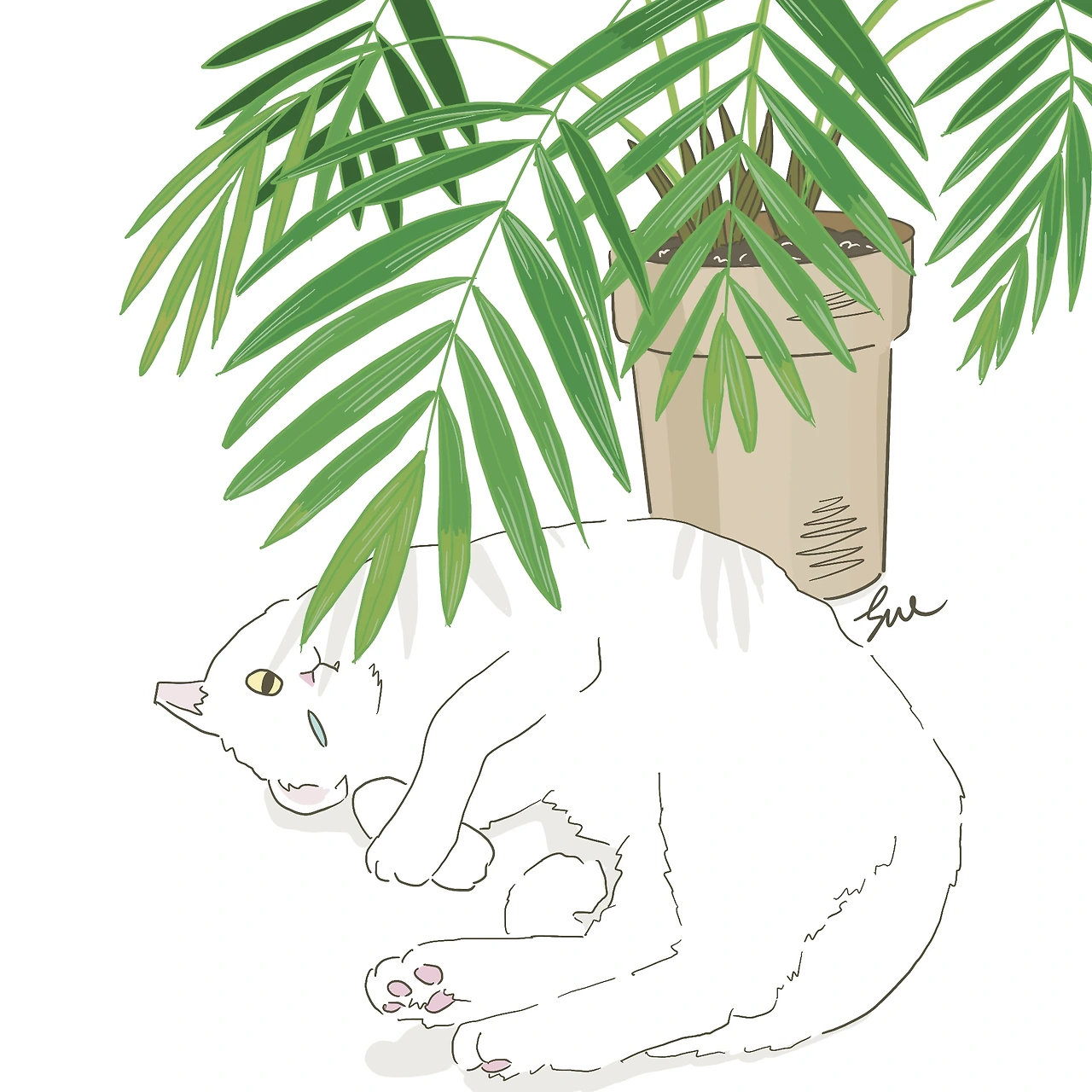 아레카야자는 마침 그런 나에게 잘 맞았던 것 같다. 나는 내가 하는 모든 일들이 그렇듯 화분을 그냥 거기에 두고 아주 가끔 들여다보았는데, 이 초록친구는 건조한 뿌리를 좋아해서 내가 물 주는 것을 잊어도 크게 개의치 않았고 목이 너무 마를 때면 커다란 잎이 눈에 띄게 쳐져서 아직 식물언어를 알아듣지 못하는 나도 눈치챌 수 있었다.