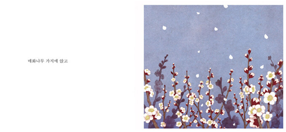 그런데 그림책의 첫 장면에서는 흰 눈이 등장한다. 겨울 하늘과 풍경 사이로 흩날리는 흰 눈이 정말 꽃잎 같다. 시간이 흐르면서 꽃잎이 흰 눈이 되고 흰 눈이 꽃잎이 되는 마술 같은 흐름을 보여준다. 겨울에 다 내리지 못한 눈이 봄을 알리는 매화꽃이 되고 다시 벚꽃이 되었고 이제 눈은 오뉴월에 조팝나무 꽃으로, 이팝나무 꽃으로 피어난다.