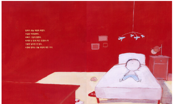 눈을 감으면 엄마가 팔을 활짝 벌리고 아이를 안아주는 거 같다. 엄마의 목소리가 듣고 싶은 아이는 뛰다가 넘어진 상처의 딱지를 손톱 끝으로 긁어서 뜯어낸다. 아파서 눈물이 찔끔 나오려 하지만 엄마의 목소리를 다시 들을 수 있다. 자신의 몸에 피를 내서라도 '기억'을 되살리려는 아이의 모습이 그려진 붉은 색 톤의 그림은 아픈 아이의 마음을 그대로 보여주는 듯하다.