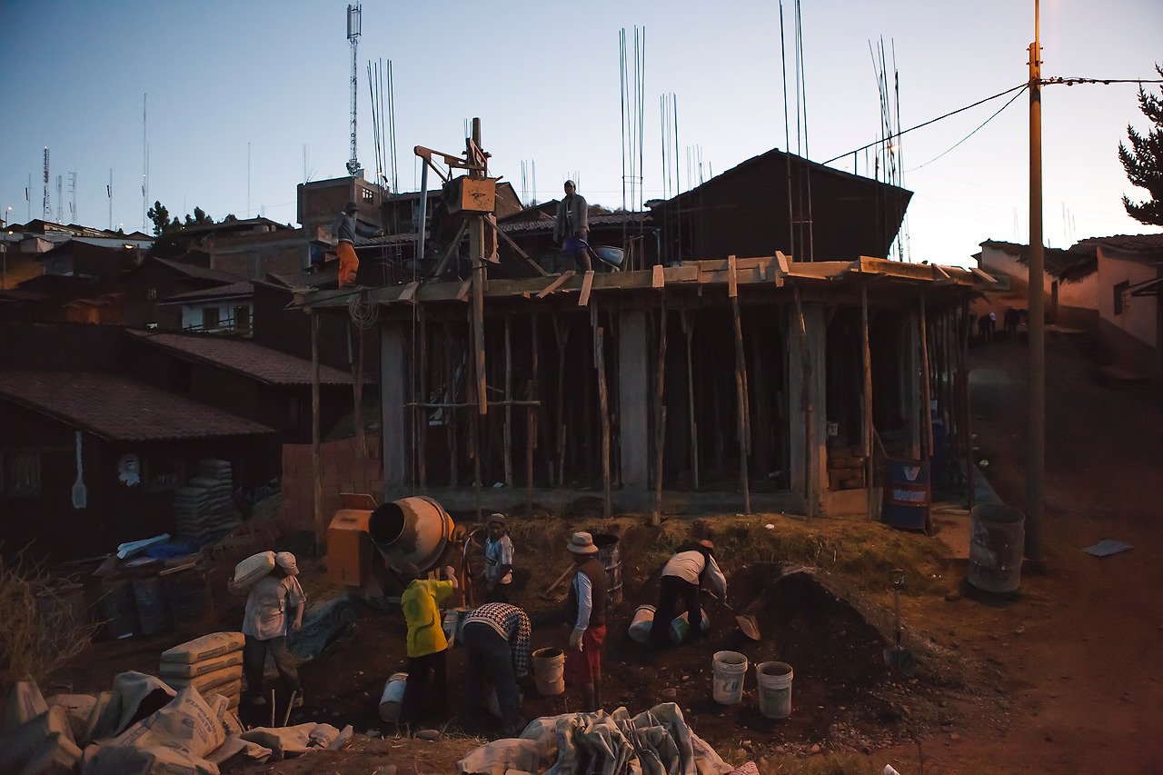 금방 해는 산맥 사이로 사라졌고 하늘에는 어둠이 내려앉았다. 그리고 쿠스코 광장의 불이 밝혀졌다. 한참 멍하니 바람을 맞으며 도시 전체를 내려다보았는데 순간 나의 귓가에 사람들의 목소리가 들려왔다. 소리가 들리는 쪽으로 몸을 돌렸더니 사람들이 모여서 같이 집을 짓고 있었다. 차가 올라올 수 없는 곳이기에 사람들이 하나씩 벽돌을 나르고 쌓고 시멘트를 발랐다. 그 모습을 보던 나는 힘들겠다는 생각을 1초 만에 날려버렸다. 그들은 웃음이 떠나지 않았고 정말 즐겁게 일하는 듯했다. 이웃의 집을 같이 짓고 있는 거 같았고 남자들이 잠시 쉴 때 여자들은 새참들을 만들어 주기도 했다. 몸은 힘들어도 같이 힘을 모아 하는 일이기에 즐거워 보였다.