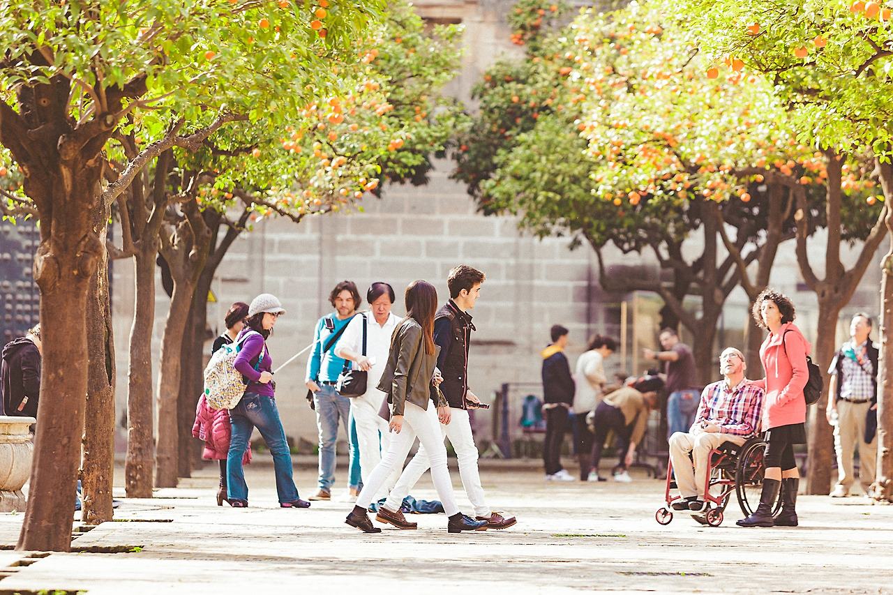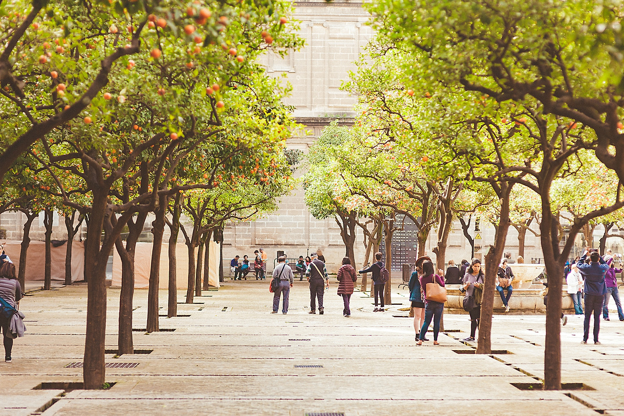 종탑을 내려와 이제 나가는 길목이었다. 그냥 생각엔 당연히 세비야 도시가 나올 줄 알았는데 오렌지 나무가 즐비한 후원 같은 곳으로 이어졌다. 넓은 공간이 참으로 인상적이었다. 많은 사람이 성당에 빠져나와 마지막 코스로 광장에서 햇살을 맞으며 시간을 보내고 있었다. 공간이 너무 이뻐 나도 어느새 벤치에 앉아 시간을 보내고 있었다. 무언가 한낮의 느끼는 여유라는 게 이 공간에 어울리는 느낌이었다. 균일하게 심겨 있는 오렌지 나무가 참으로 인상적으로 다가왔다. 먹기만 해봤지 이렇게 관상용으로 쓰일 거라는 생각을 눈곱만큼도 없었기에 이곳 세비야가 약간 특별한 공간으로 느껴 졌을 거라 개인적으로 생각한다.