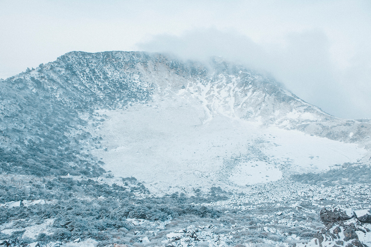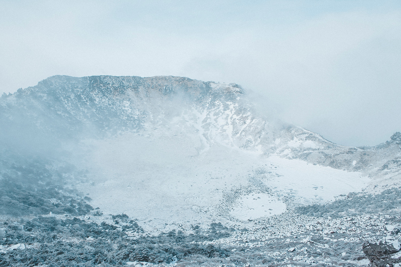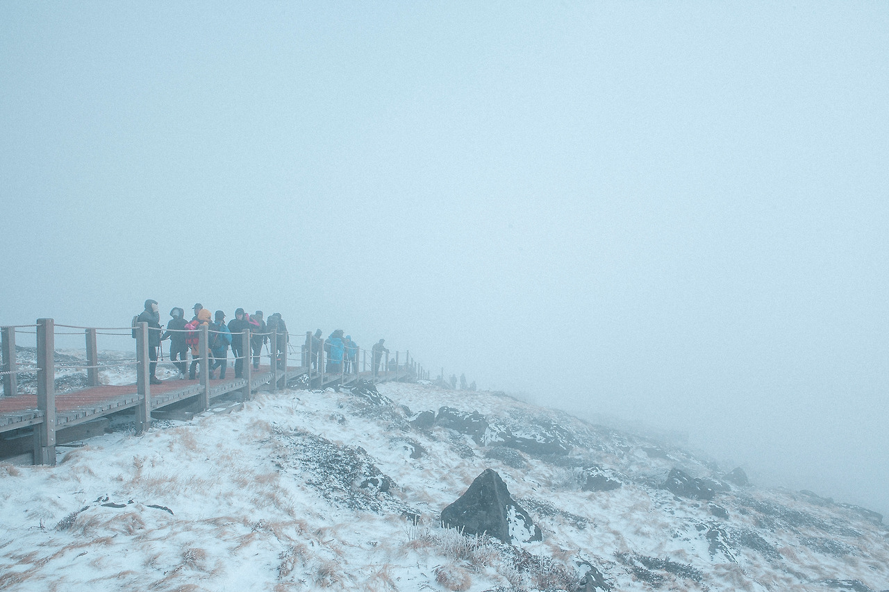 나에게 백록담은 애증의 단어이다. 3번 올라서 제대로 백록담을 본 적이 없기 때문에 이번에도 백록담을 본다는 기대치가 그리 높지 않았다. 제대로 본건 다 합쳐 5분도 안 되기에 더욱 그랬던 거 같다. 정상은 제대로 서 있기 힘들 정도로 바람이 세차게 불었다. 사진을 찍기 위해 장갑을 벗었는데 손가락이 순식간에 감각이 없어지는 현상을 느꼈다. 그래도 눈 덮인 한라산을 보게 해준 의미에서 꼭 사진을 찍고 가리라는 마음으로 딱딱하게 굳어가는 손가락을 입으로 녹이면서 셔터를 눌렀다. 역시나 백록담은 구름으로 덮여 있었기에 당연하다고 생각하며 아쉬움을 달래던 찰나에 구름이 점점 바람이 밀려나 온전한 한라산 정상의 백록담이 눈에 들어왔다. 한동안 그 모습을 보여준 모습에 나는 연신 셔터를 눌러댔다. 주변에서도 사람들의 탄성 소리가 여기저기서 들려온다. 그들이 이 추위를 뚫고 이 높은 산에 올라온 목적은 나와 같았기에 그들의 목소리는 곧 내 목소리 같이 느꼈다.