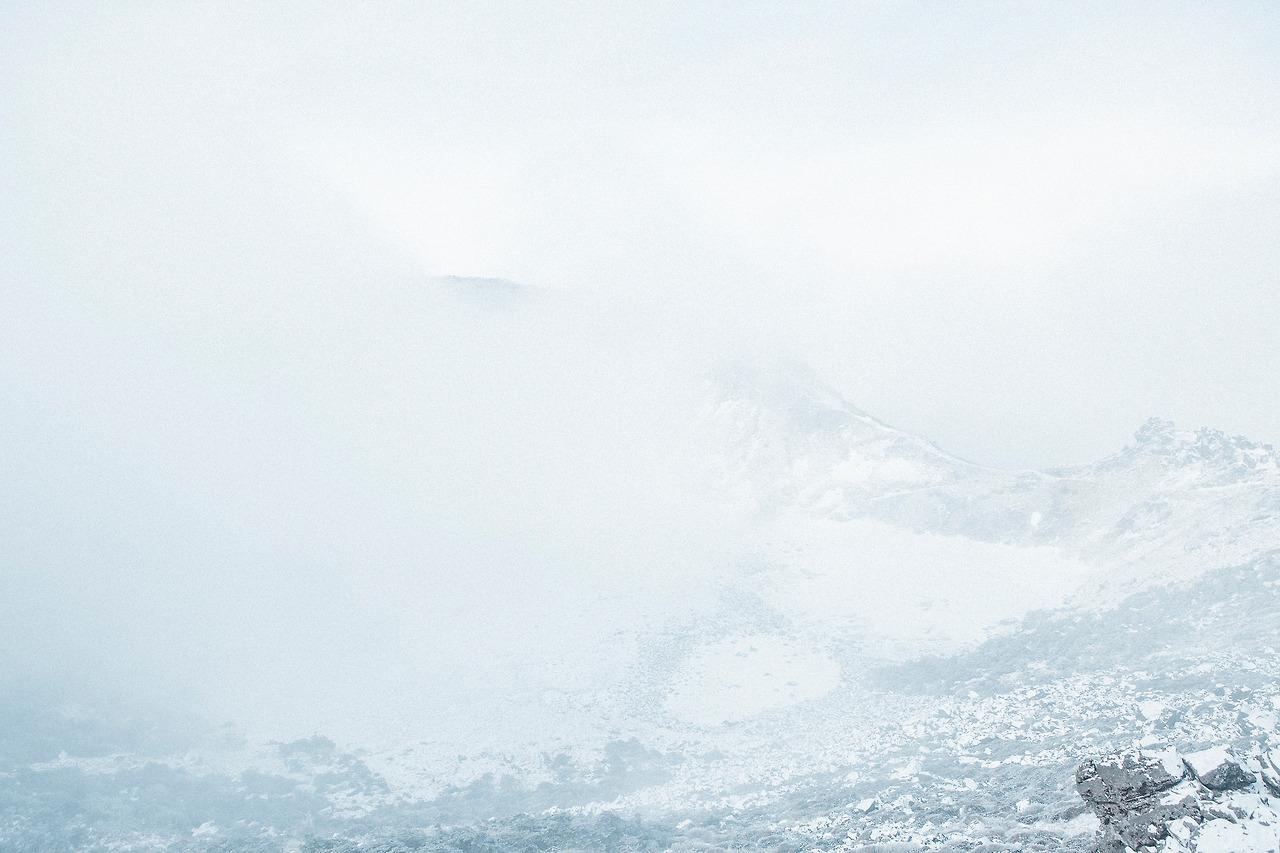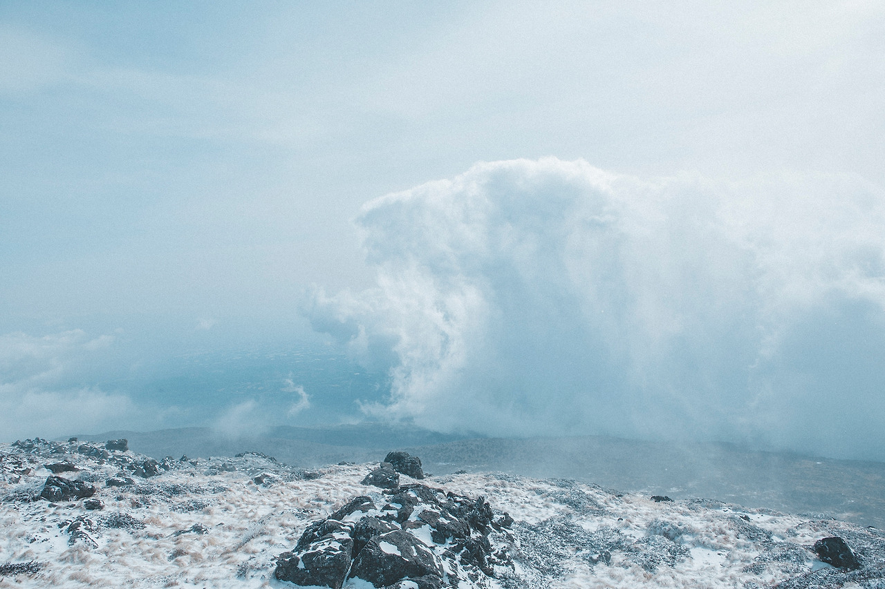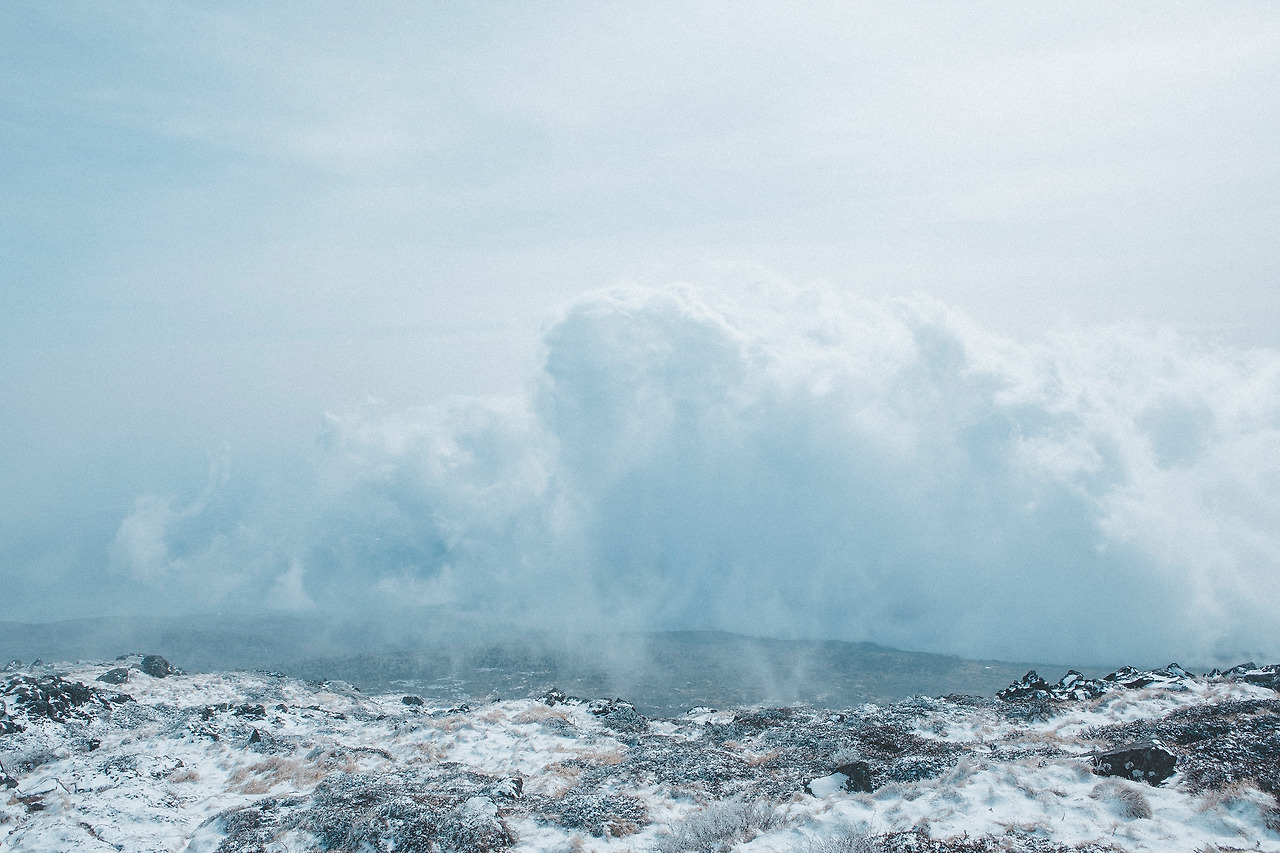 나에게 백록담은 애증의 단어이다. 3번 올라서 제대로 백록담을 본 적이 없기 때문에 이번에도 백록담을 본다는 기대치가 그리 높지 않았다. 제대로 본건 다 합쳐 5분도 안 되기에 더욱 그랬던 거 같다. 정상은 제대로 서 있기 힘들 정도로 바람이 세차게 불었다. 사진을 찍기 위해 장갑을 벗었는데 손가락이 순식간에 감각이 없어지는 현상을 느꼈다. 그래도 눈 덮인 한라산을 보게 해준 의미에서 꼭 사진을 찍고 가리라는 마음으로 딱딱하게 굳어가는 손가락을 입으로 녹이면서 셔터를 눌렀다. 역시나 백록담은 구름으로 덮여 있었기에 당연하다고 생각하며 아쉬움을 달래던 찰나에 구름이 점점 바람이 밀려나 온전한 한라산 정상의 백록담이 눈에 들어왔다. 한동안 그 모습을 보여준 모습에 나는 연신 셔터를 눌러댔다. 주변에서도 사람들의 탄성 소리가 여기저기서 들려온다. 그들이 이 추위를 뚫고 이 높은 산에 올라온 목적은 나와 같았기에 그들의 목소리는 곧 내 목소리 같이 느꼈다.