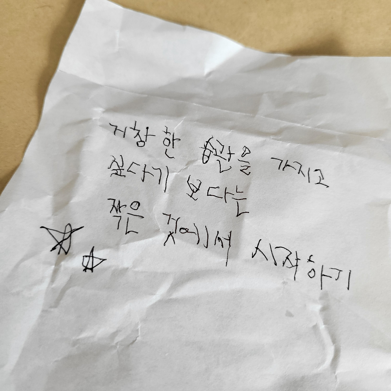 왼손에게 오른손 일을 그대로 하라고 하면 안 되는 거였다. 적응할 시간도 없이 실무에 들어간 왼손이 당장 얼마나 잘할 수 있었을까. 그래서 가장 기초적인 것에서 천천히 시작하기로 했다. 왼손으로 글씨쓰기. 내 왼손은 아직 유치원생이다. 근데 왼손이나 오른손이나 글씨체는 비슷하다. 안타깝게도.
