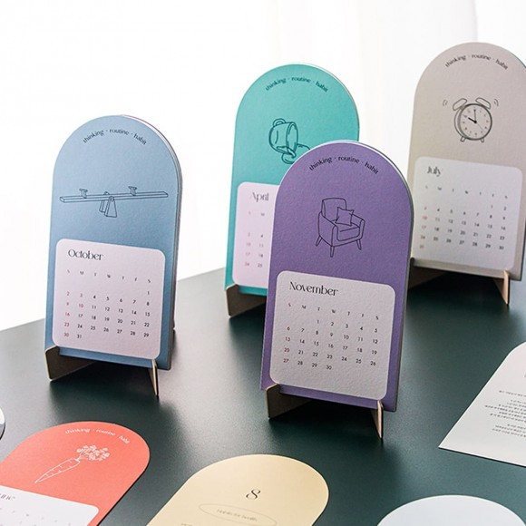 디자인은 개인의 취향이기에 어느 게 옳고 그르다고 할 수 없다. 하지만 명확하게 유행하는 디자인과 컬러는 존재한다. 우리는 활용 범위가 좁은 벽걸이형에서 벗어나 탁상형 캘린더로 시선을 옮겼다. 대부분의 사람들이 가장 많이 시간을 쓰는 책상에 두거나 인테리어용으로 거치할 수 있도록 자리 차지가 적은 형태로 구현했다. 그리고 컨텐츠를 담았다. 월별 추천 습관을 앞면 일러스트로 간결하게 표현하고 그 습관에 기반한 짧은 글을 매달 뒷면에 넣은 것이다.
