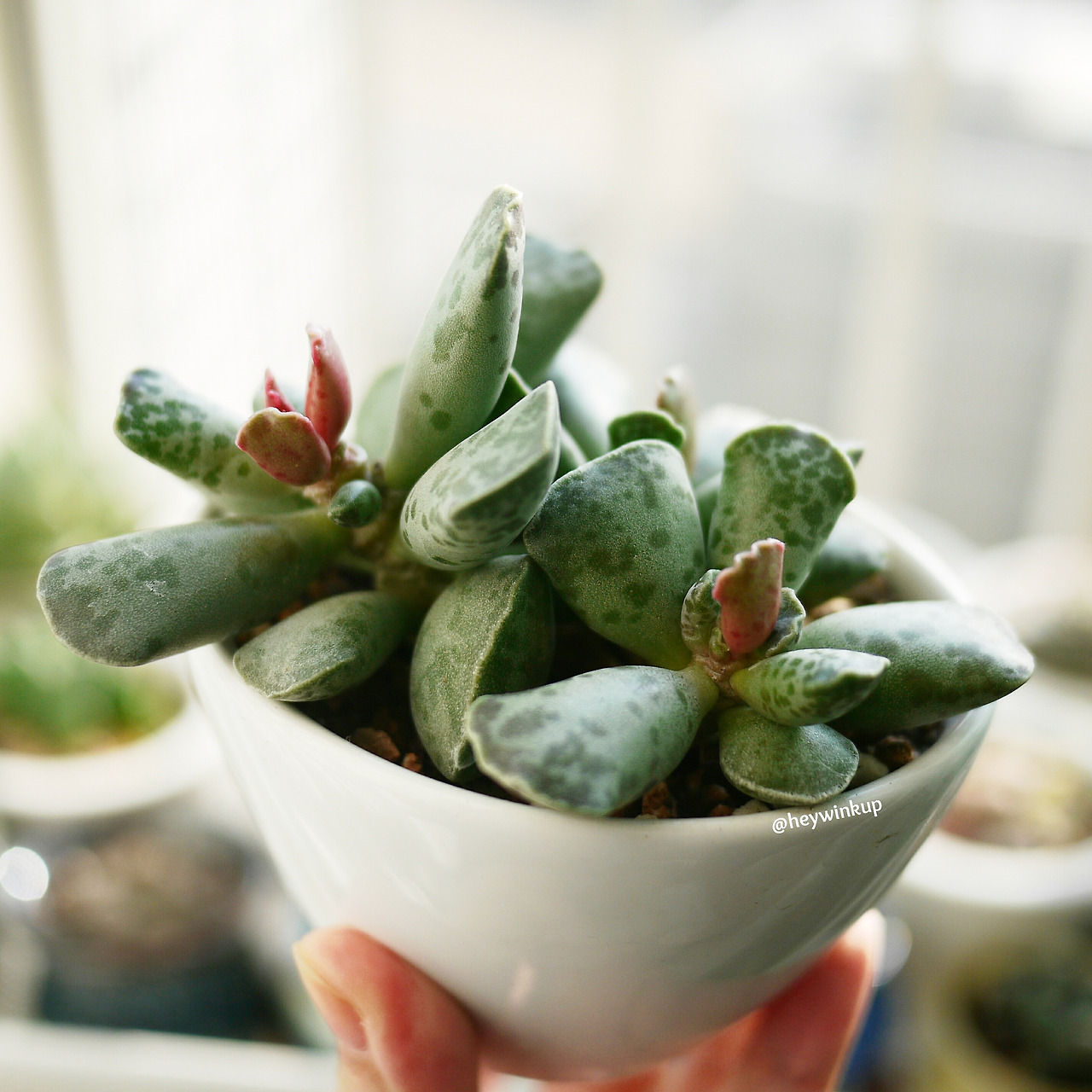 제옥과 비슷하면서도 가장 다른 부분은 매끈매끈한 얼굴. 지우개를 만지는 것 같은 느낌이 재미있는 이 다육이는 금영이다. 제옥처럼 입을 벌리고 새로운 얼굴이 나오며 기존의 얼굴은 껍질이 되어 떨어져 나간다. 제옥과 금영은 모두 화려한 색상의 꽃을 피운다. 도저히 자연적이지 않아 보이는 청량한 민트색이 볼 때마다 신기하다.