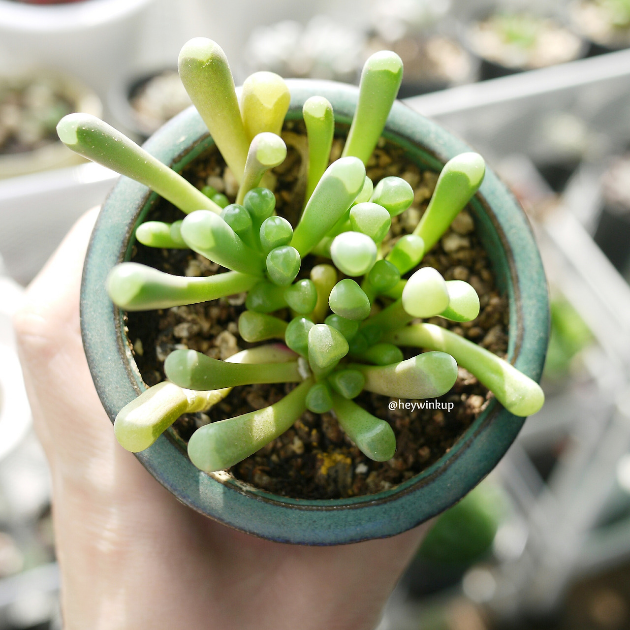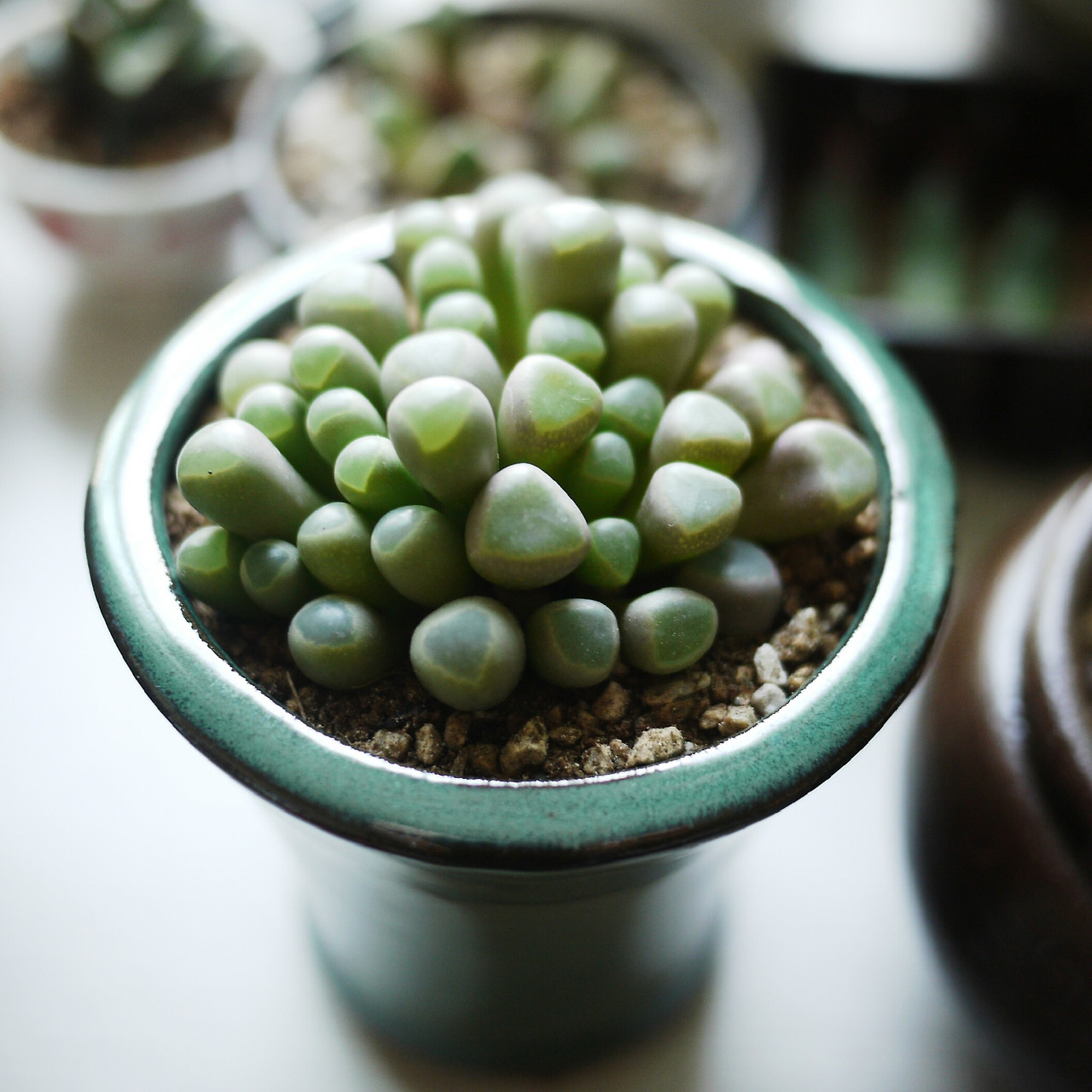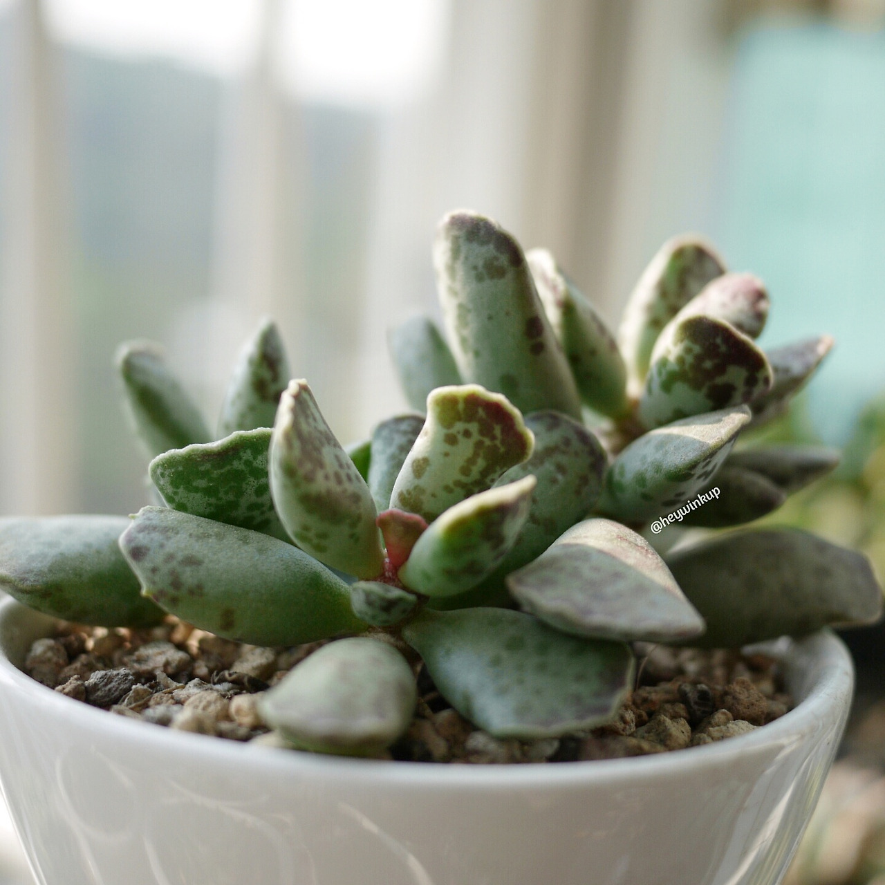 외계 생물이 있으면 이렇게 생기지 않았을까? 가지런한 모습일 때는 영락없이 아기들의 통통한 발가락을 닮아 외국에선 'babytoe'라고 불리기도 하는데 우리나라에선 꽃의 색에 따라 다른 이름들이 붙어 있다. 동그란 잎 끝에 색이 다른 부분이 햇빛을 받는 창의 역할을 한다. 사진의 다육이는 군옥으로, 일반적인 동향 베란다에서 길렀더니 처음의 가지런하고 예쁜 모습은 사라지고 자기주장이 강한 모습으로 살아가고 있다. 너무 강한 빛을 받으면 녹아버리고, 너무 많은 물을 먹으면 터져버리는, 굉장히 직관적인 다육이. (그러니 여름에 특히 조심해야 한다)