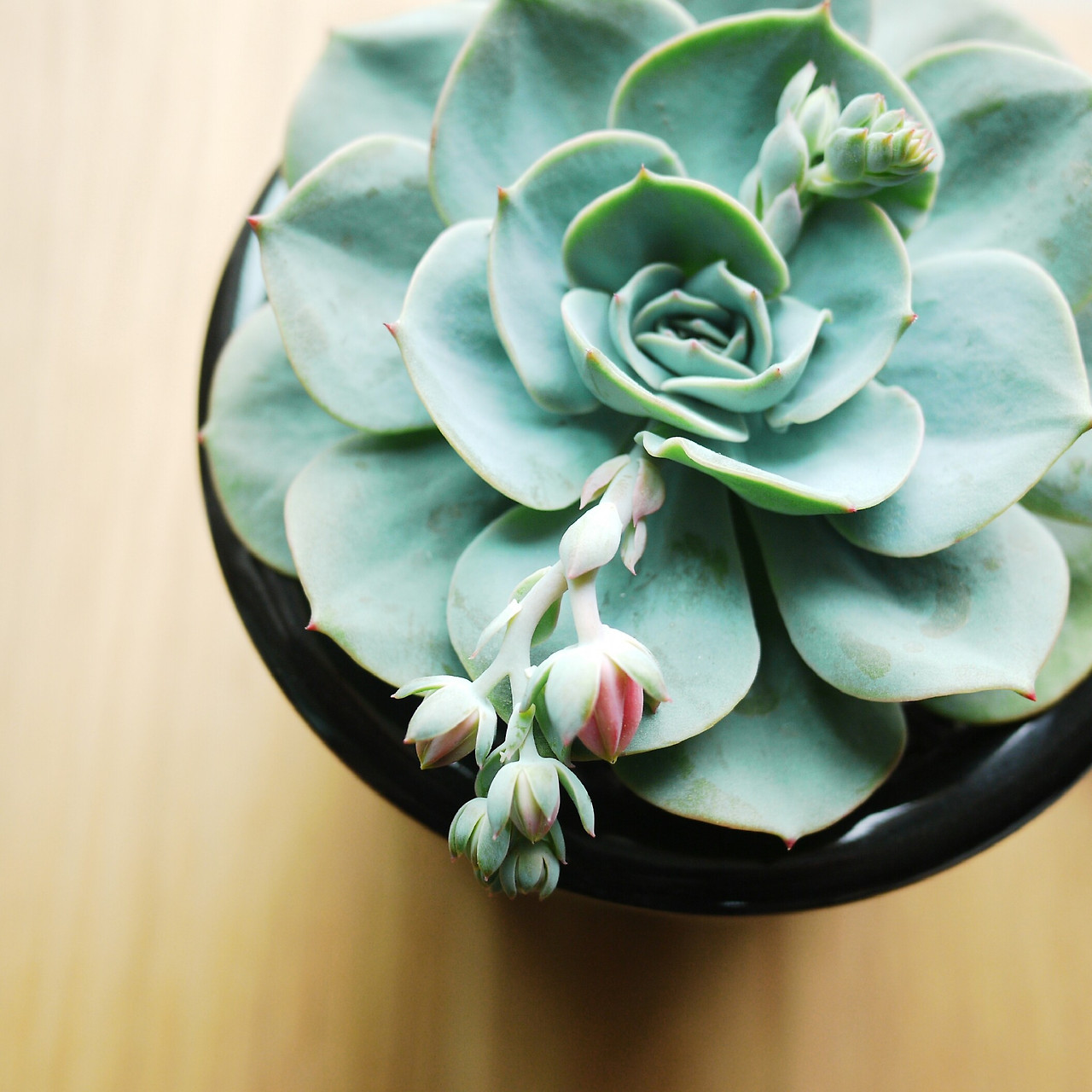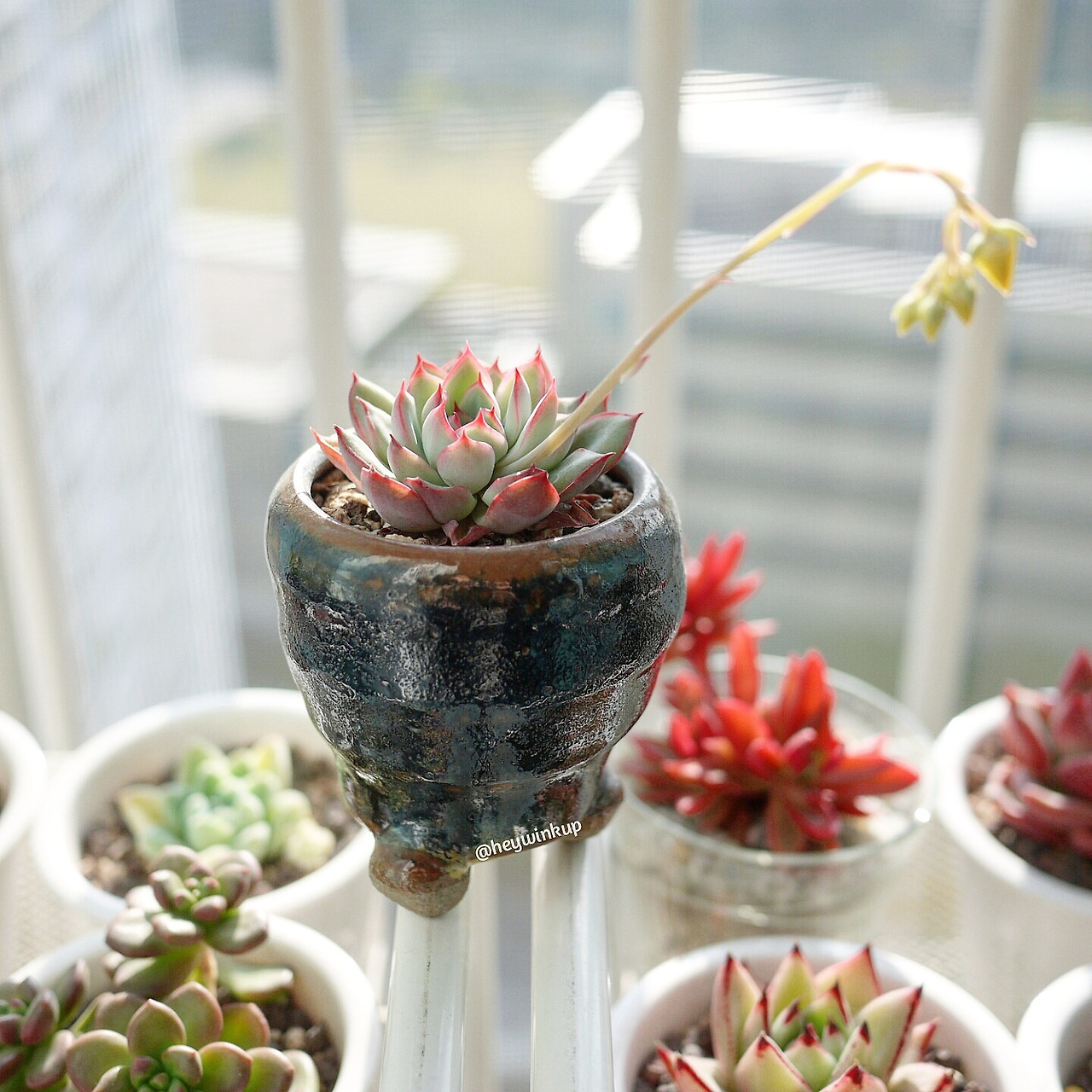 고른 치아처럼 가지런한 화이트미니마Echeveria 'white minima' 얼굴 한가운데서 꽃대가 쑥 올라왔다. 이럴 때는 기분이 싱숭생숭하다. 분명 예쁜 꽃을 보게 되는 건 기쁜 일이지만, 꽃대가 나오면 가지런하고 예쁘던 본체의 얼굴이 망가질 수도 있다. 안절부절못하는 사이 꽃대는 점점 길어지더니 낚싯대처럼 길게 드리웠다.