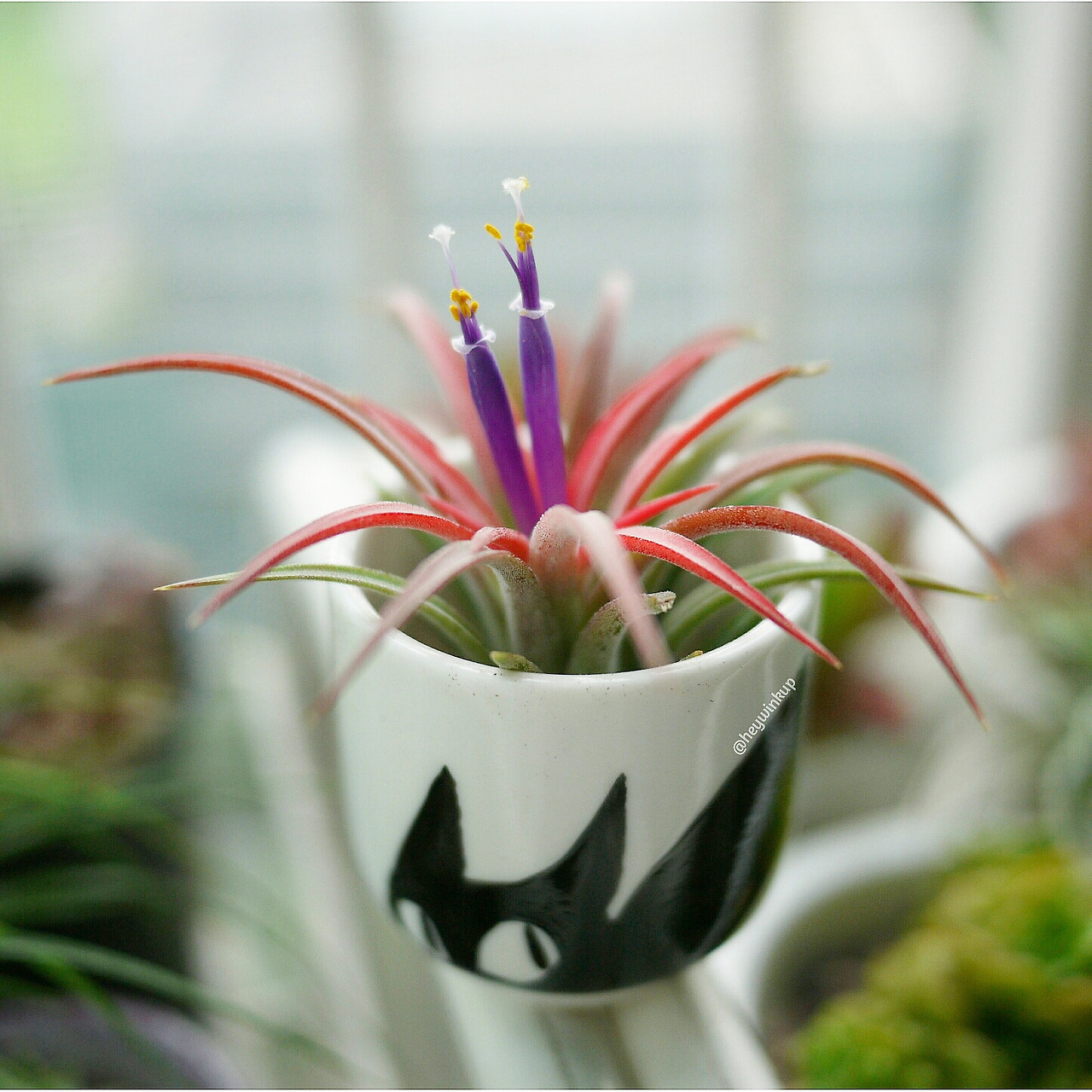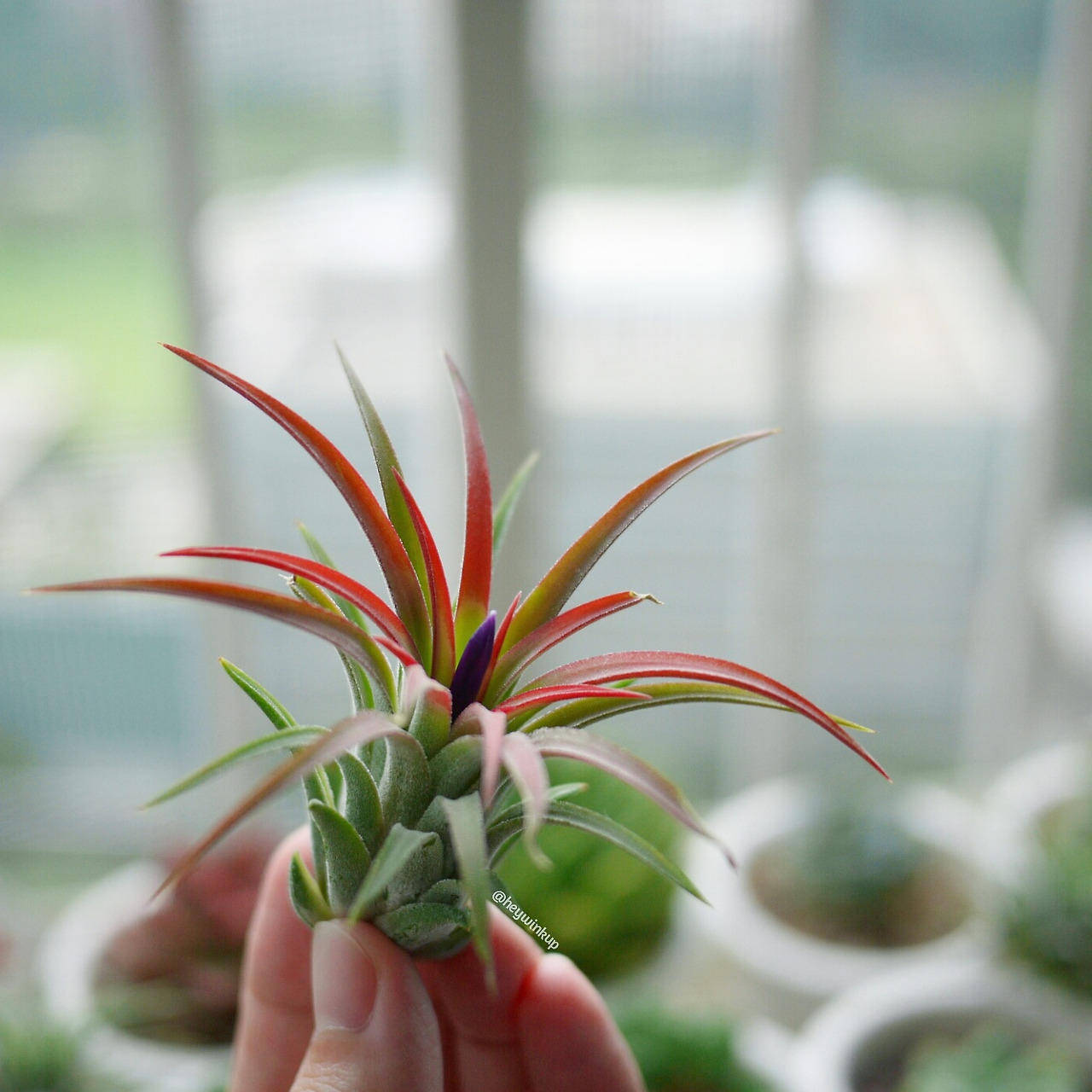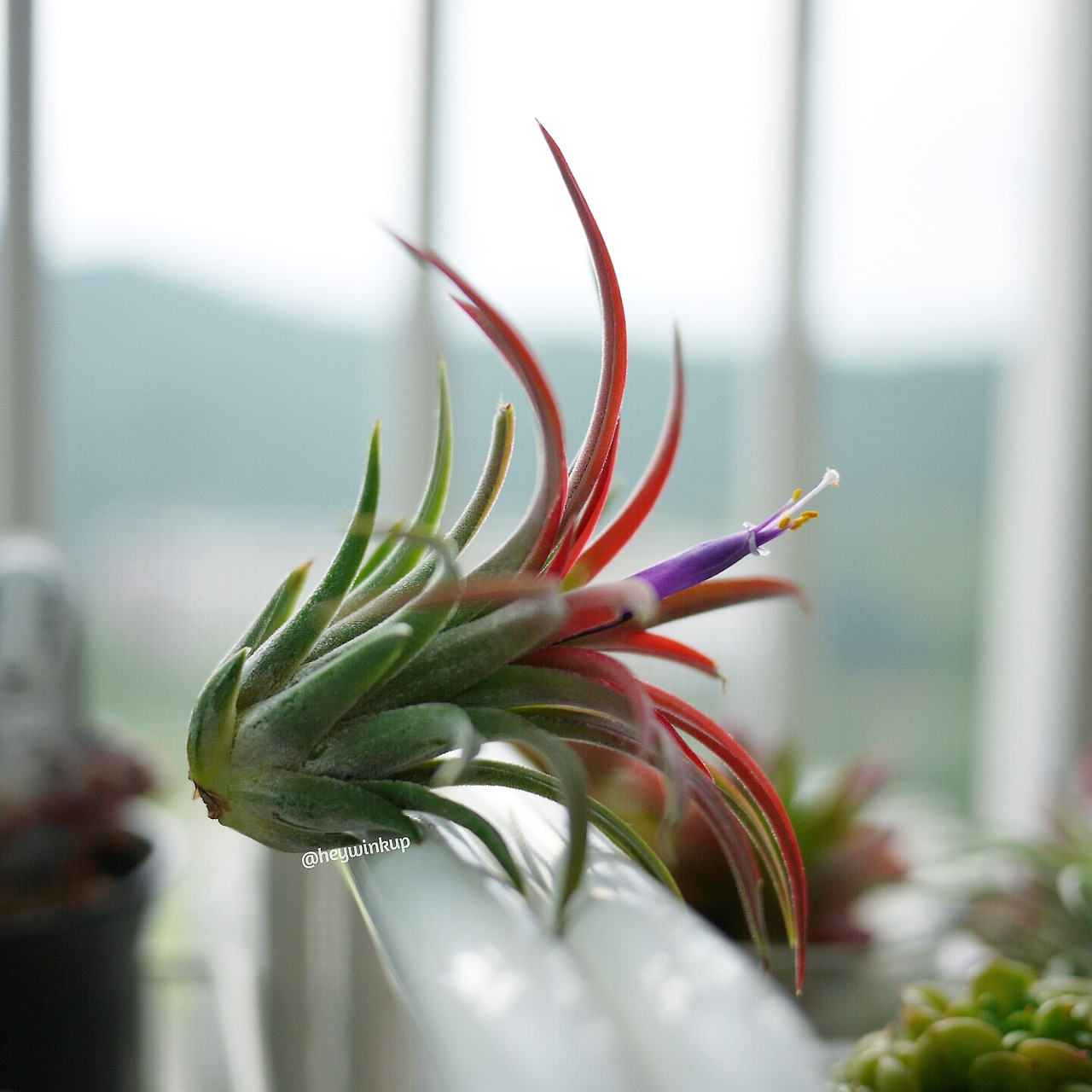 며칠 전부터 이오난사의 잎 끝이 빨갛게 변했기에 알아봤더니 꽃을 피우려고 준비하는 모습이라는 답을 얻었다. 기대가 크면 실망할 것 같아 마음을 살짝 감추고 있었는데 물든지 3일 만에 보라색의 꽃봉오리를 수줍게 올렸다. 생각보다 빠르게 찾아온 첫 틸란드시아 꽃 덕에 녀석들에 대한 애정도가 확실히 깊어진 것 같다.