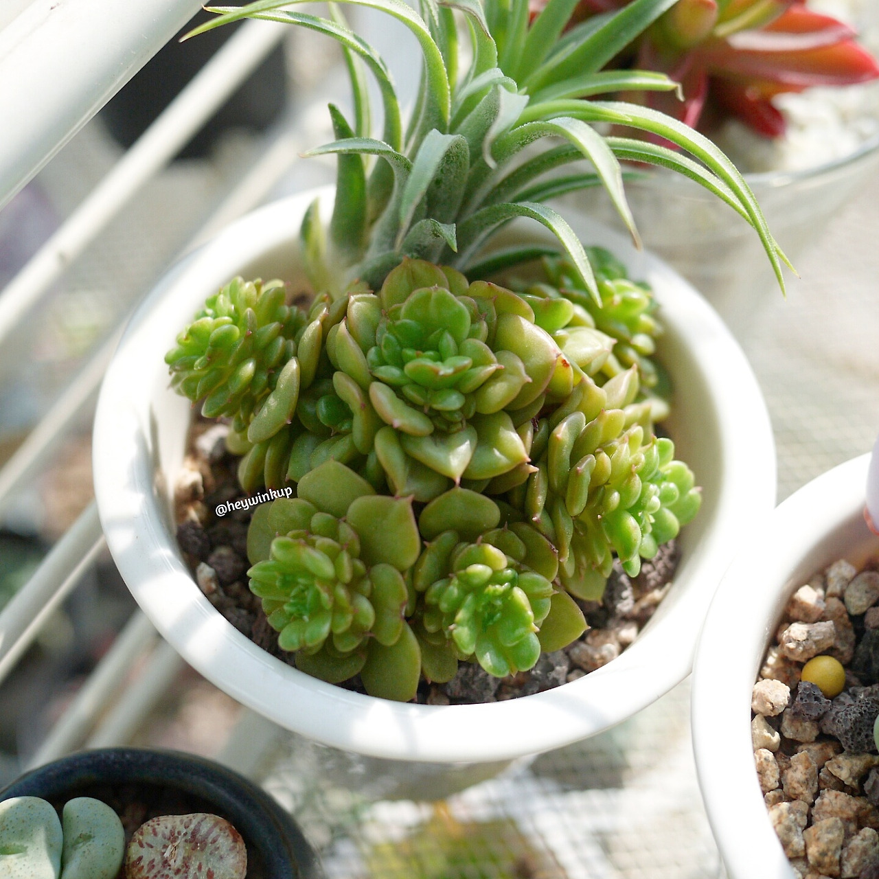 아무리 환경과 종류가 다르더라도, 물을 주는 주기 자체는 천차만별이라도, 글쓴이에게는 다육이에게 물 주기 원칙이 하나 있다. 한 번 줄 때만큼은 듬뿍 주고, 화분 밖으로 물이 쭉쭉 빠져나가는 것을 눈으로 확인하는 것이다. 스프레이로 칙칙, 숟가락으로 찔끔, 얼마나 감질나겠나? 그래 놓고는 틸란드시아에는 다른 기준을 적용할 뻔했다. 틸란드시아 역시 한 번 줄 때 제대로 주면 되는 것이었다.