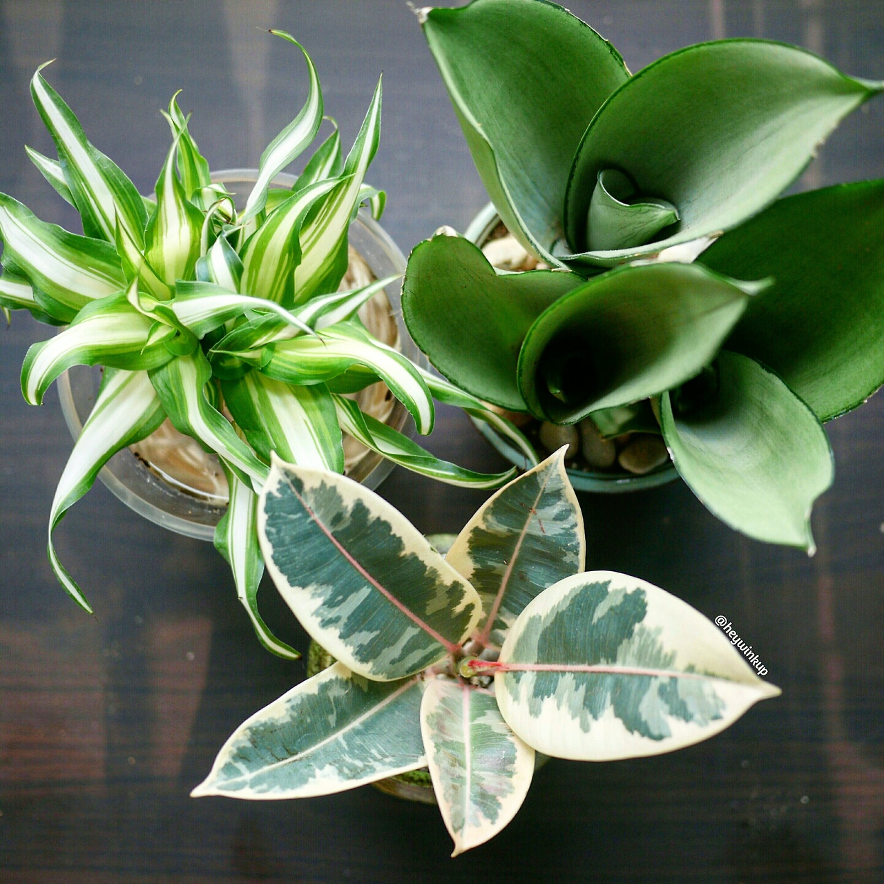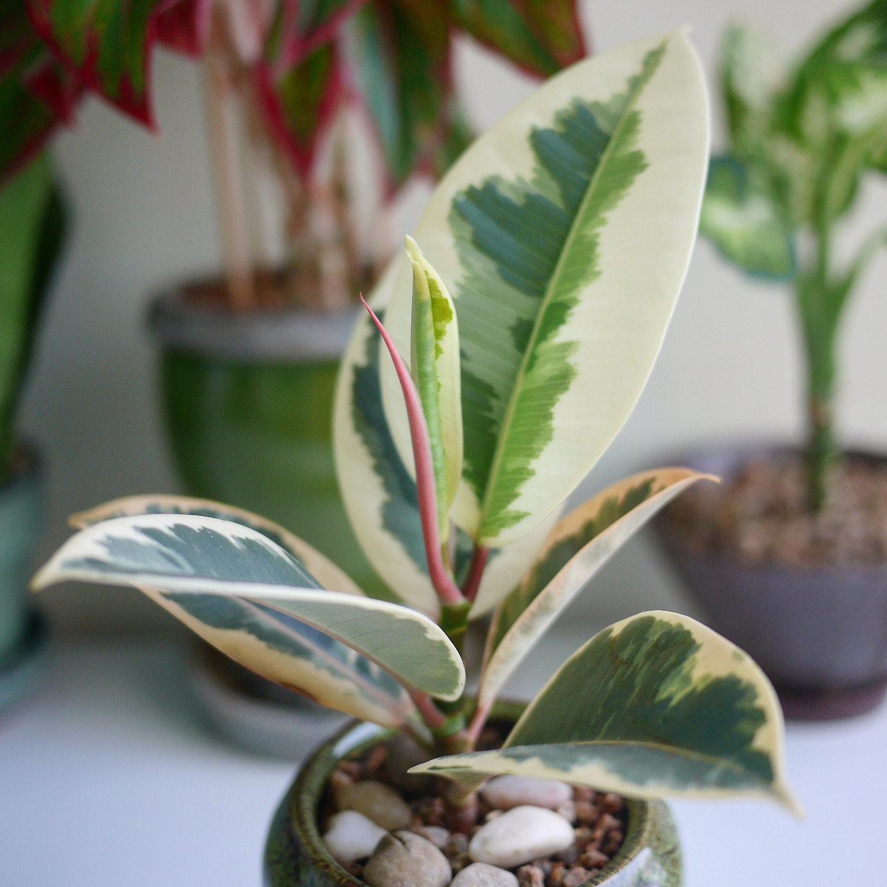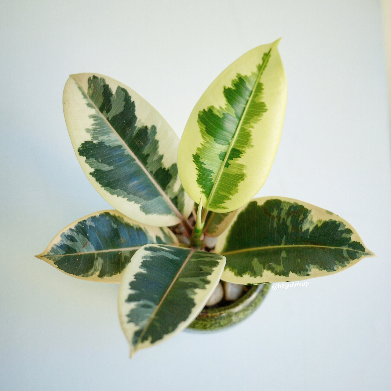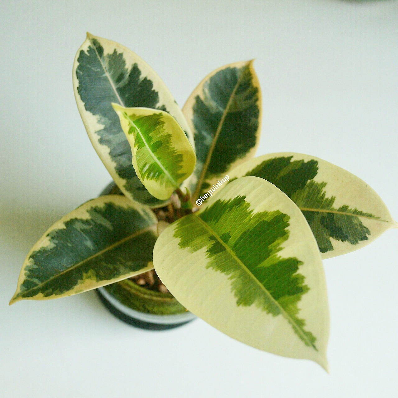 수채화 고무나무라는 이름의 식물을 처음 본 건 1년 전쯤이었는데, 이름 그대로 붓으로 쓱쓱 덧칠해놓은 듯한 무늬에 한눈에 반했던 터였다. 하지만 같은 이름을 가지고도 다른 얼굴을 한 고무나무 시리즈는 왜 그리 많은지. 또한 '칼라 고무나무' '수채화 고무나무' '무늬 고무나무' 등의 다양한 이름을 가지고 있어 한 번에 찾아내기도 쉽지 않았다. 그러던 올해 여름 초입, 드디어 수채화 고무나무를 새 식구로 맞이하게 되었다.