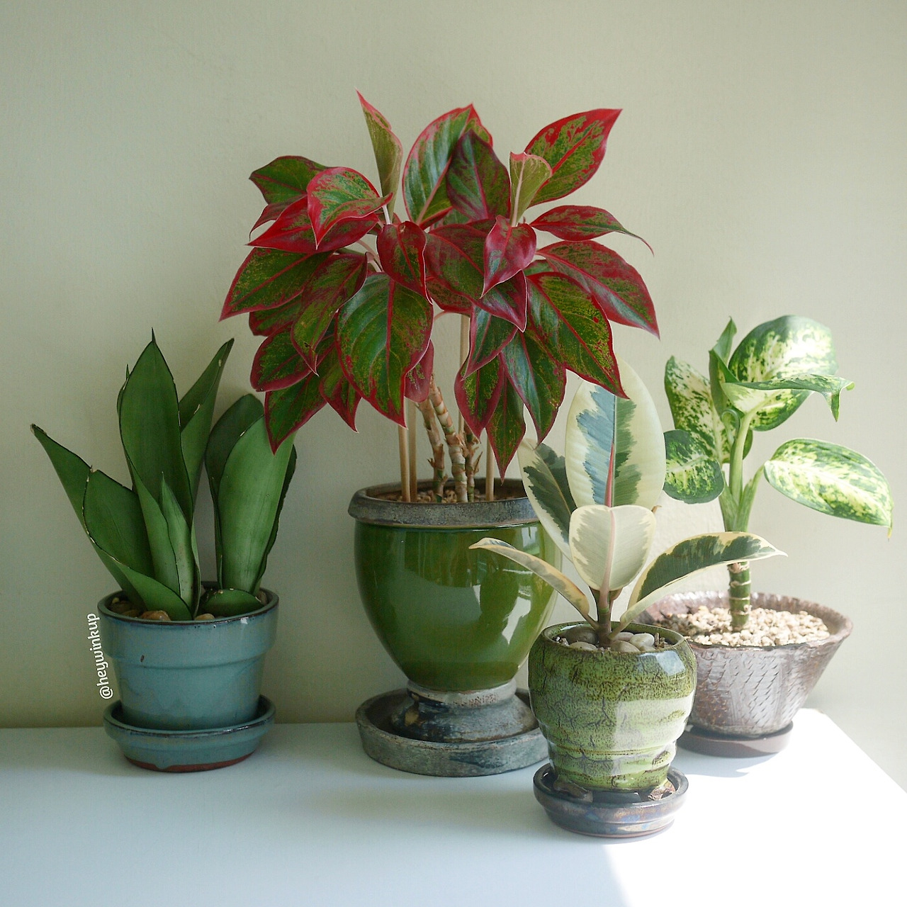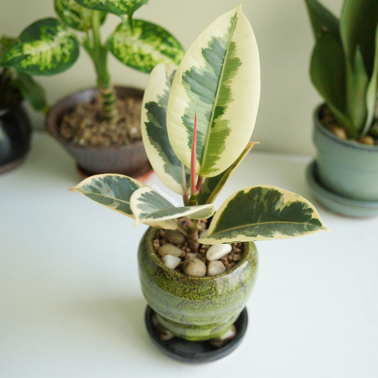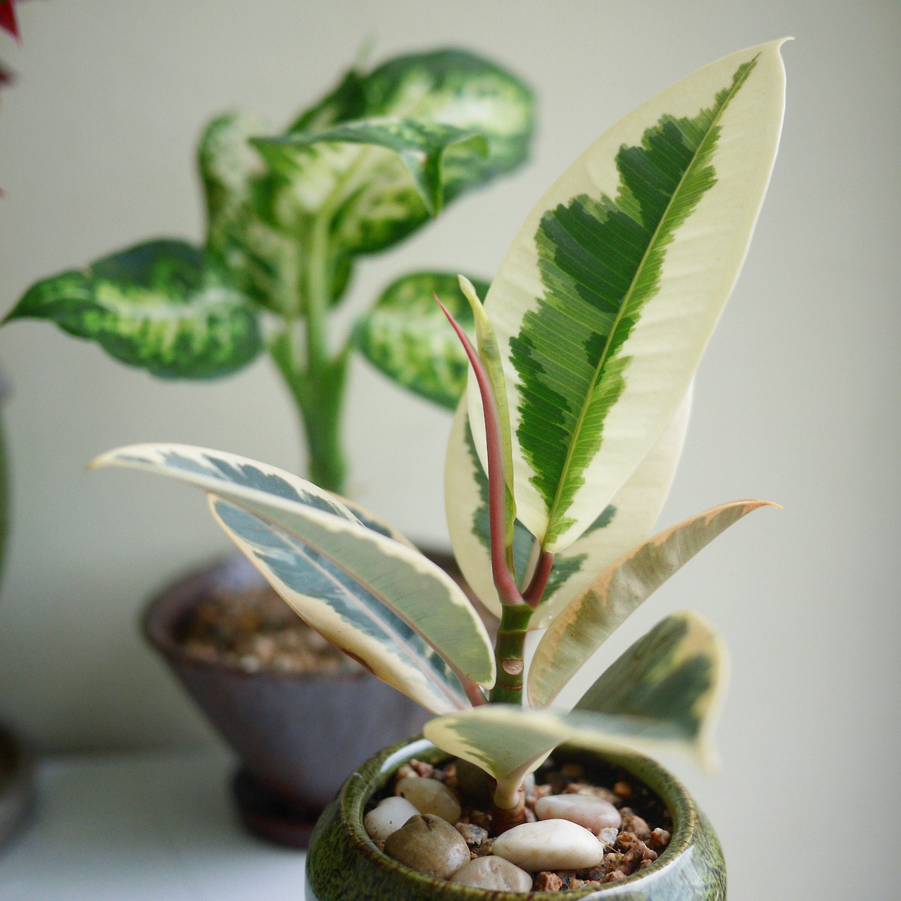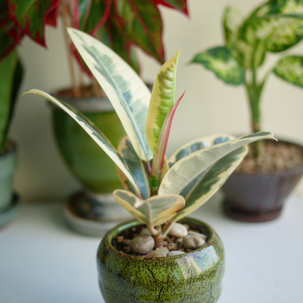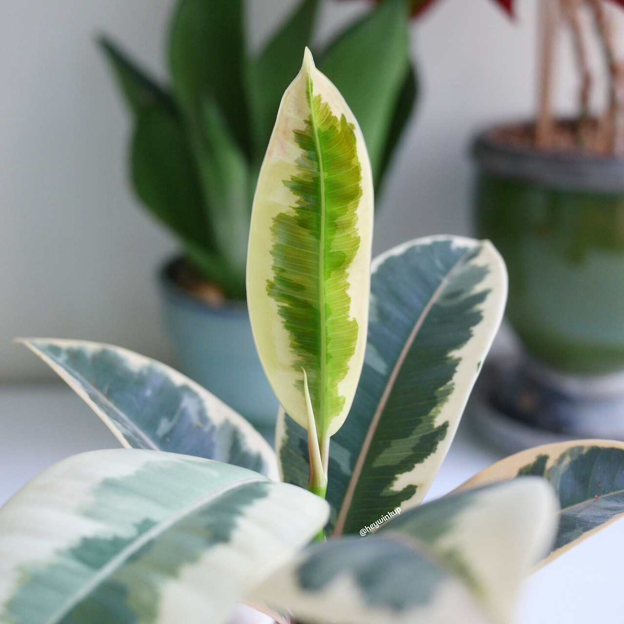 수채화 고무나무라는 이름의 식물을 처음 본 건 1년 전쯤이었는데, 이름 그대로 붓으로 쓱쓱 덧칠해놓은 듯한 무늬에 한눈에 반했던 터였다. 하지만 같은 이름을 가지고도 다른 얼굴을 한 고무나무 시리즈는 왜 그리 많은지. 또한 '칼라 고무나무' '수채화 고무나무' '무늬 고무나무' 등의 다양한 이름을 가지고 있어 한 번에 찾아내기도 쉽지 않았다. 그러던 올해 여름 초입, 드디어 수채화 고무나무를 새 식구로 맞이하게 되었다.