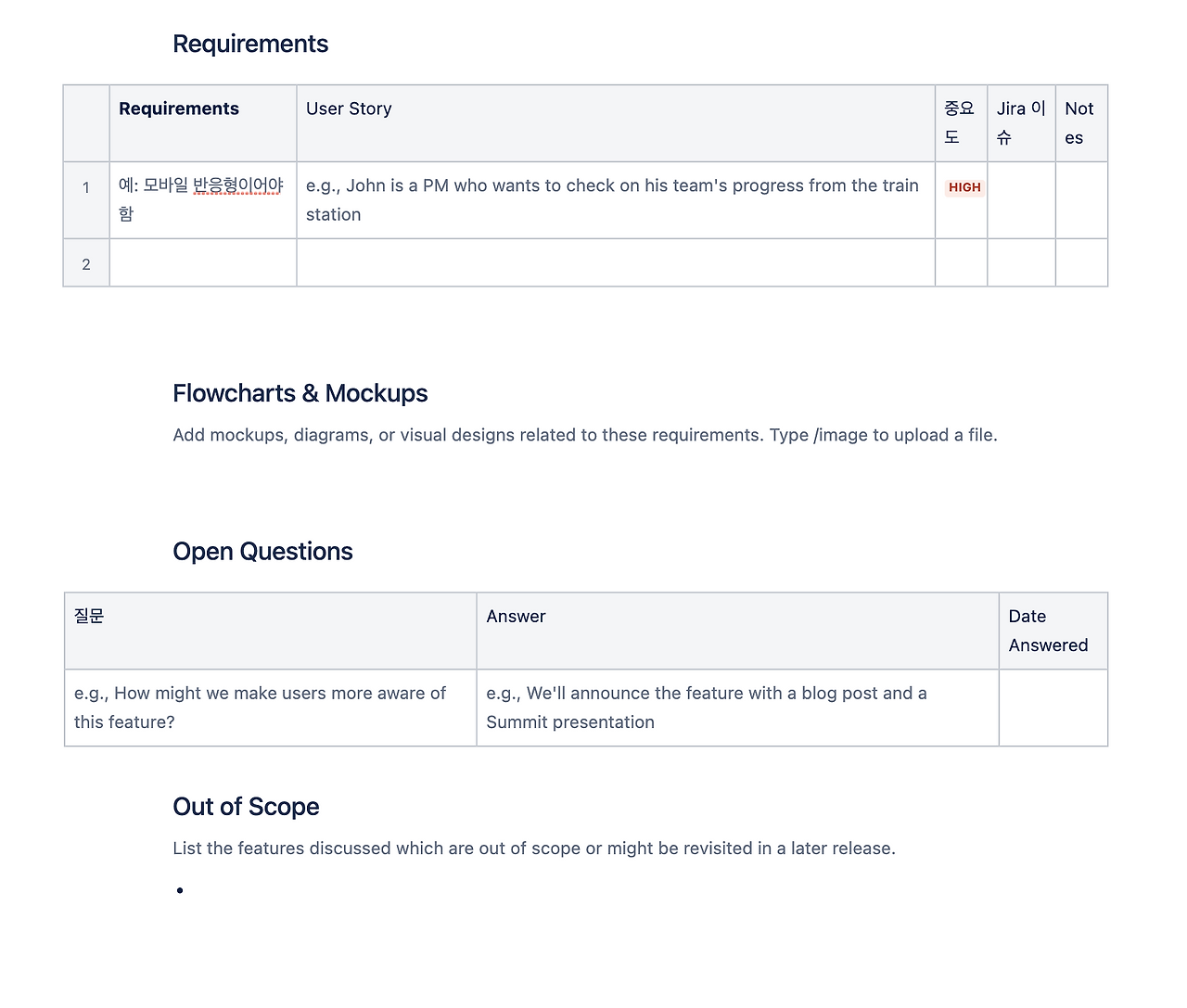 요구사항을 작성하는 도구와 탬플릿은 조직의 협업 방식, 제품화 단계, 개인 성향에 따라 다를 수 있다. 필자도 파워포인트, 카카오 오븐, 구글 독스, 컨플루언스 등을 사용했다. 그러면서 느낀 점은 어떤 도구, 탬플릿을 사용하는지 별로 중요하지 않다는 것이다. 중요한 건 제품 방향성을 논리적으로 명확하게 작성할 수 있어야 한다는 점이다. 이를 어떻게 작성해야 하는지 주요한 요소별로 알아보겠다.
