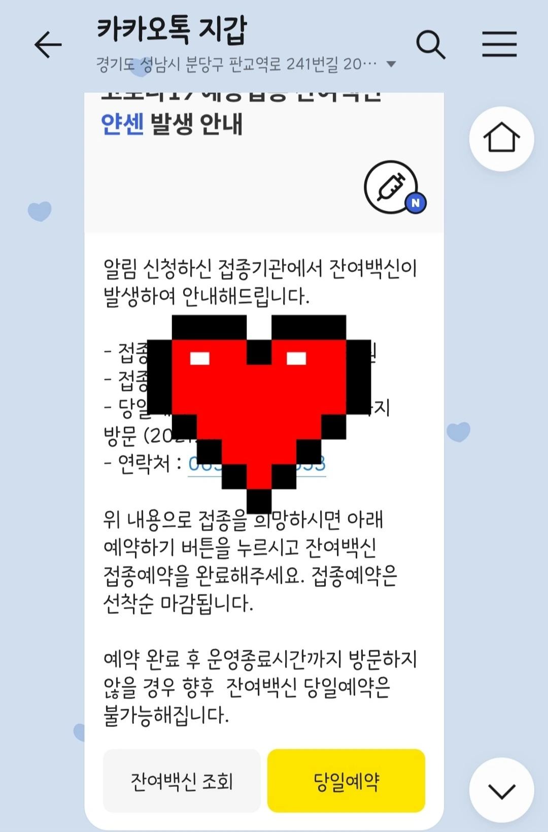 남편의 답장과 동시에 아까와 같은 팝업창이 카카오톡 지갑으로부터 전송되었다. 이번엔 다른 병원이었다. 좀 전의 실패를 딛고 '클릭', '클릭.' 두 번의 클릭질 끝에 이런 메시지를 받아 들 수 있었다. '잔여백신 당일 예약이 완료되었습니다." 남편에게 아래와 같이 장엄한 메시지를 남기고 나갈 준비를 했다.