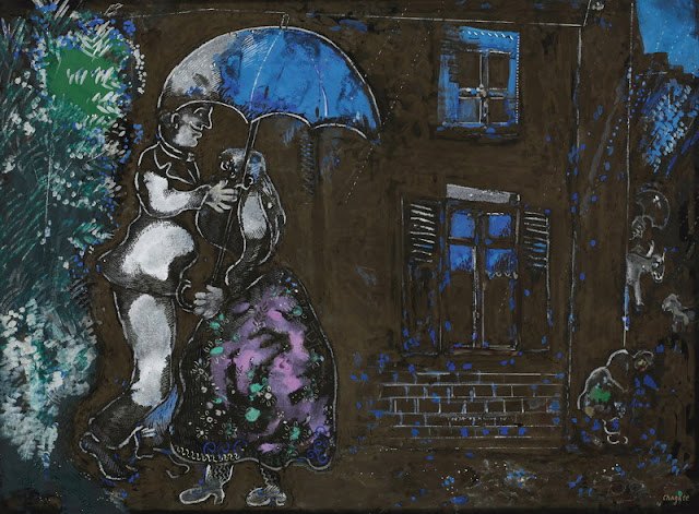 하지만 그 일이 비 오는 날 그 사람과의 추억 전부는 아니다. 운 좋게 어둠 속에서 장마 비가 그치고 처마 한 끝에서 떨어지는 빗물 소리가 그 사람을 나의 그 사람으로 돌려보낸 날은 마치 1926년 마크 샤갈 작품 Couple in the Rain 과 닮았다. 유월 그 즈음 나는 매년 그 추억으로 비 내리는 하루를 보낸다.