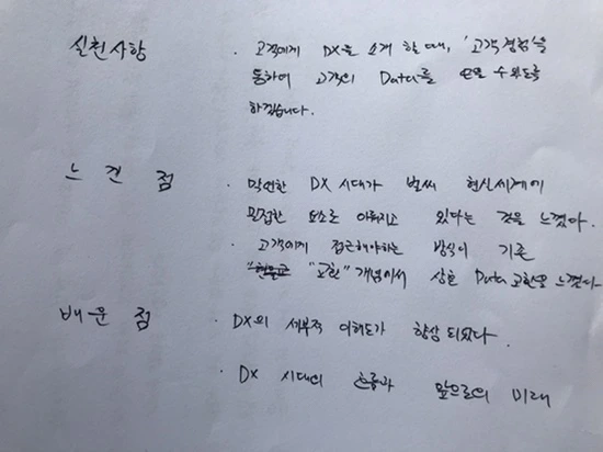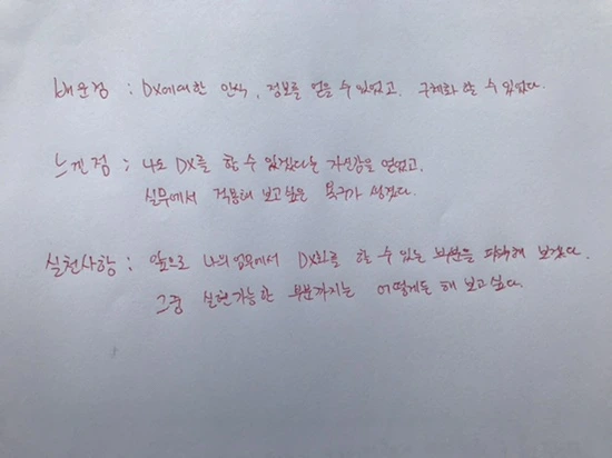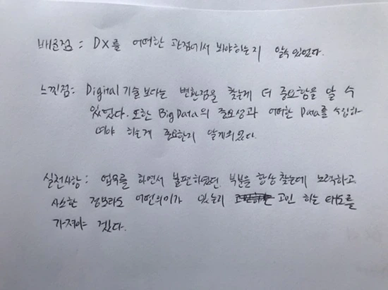디지털 트랜스포메이션 통칭 'DX'로 쓰는 이 용어 의미는 비즈니스 생태계를 다시 짜야 하는 것이다. 이 의미를 몇 번이나 되새김질하면서 벼르고 벼른 DX 워크숍을 잘 마쳤다. 현업에 돌아가면 중도에 포기했던 한 프로젝트를 DX 관점으로 새롭게 시도해 보겠다는 소감은 내게 성취감을 안겨 줬다. 아무리 뜨거운 여름일지라도 이처럼 열정적인 학습자 변화는 더 뜨거워도 데이지 않고 되레 강의 근육이 튼튼해지는 느낌이다.