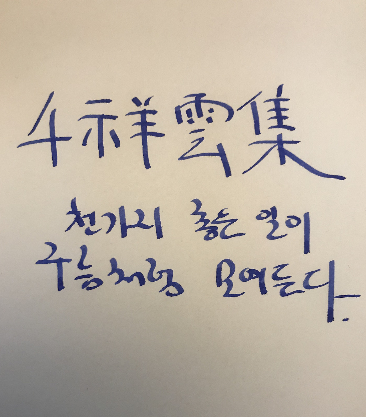 한데 이 사자성어를 '천양운집(千洋雲集)' 그러니까 '천 개 바다가 구름으로 모인다'라는 말을 '좋은 일이 구름처럼 모여든다'라는 말로 쓴다 한다. 아마 '선(洋)' 자를 '양(祥)'자로 잘 못 쓴 쓰임이라는 말이 중론이다. 실은 나도 '천양운집'으로 썼다. 하지만 잘 못 씀을 깨닫고 곧바로 바꿔썼고, 내친김에 한자를 써 의미를 새기는 것으로 마음을 바로 잡았다.