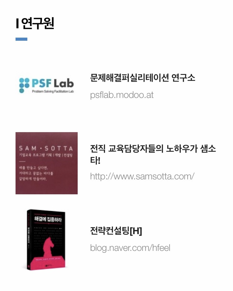 2018년 12월로 기억한다. 연구회 홈페이지 개발 회의를 했을 때를 말이다. 그로부터 18개월여 후인 오늘(5. 30. 토) pslogic.co.kr 문제해결연구회 홈페이지 문을 열었다. 홈페이지 메뉴는 당시 회의(안)을 반영했다. 여기에 #해결에집중하라 메뉴를 추가했다.
