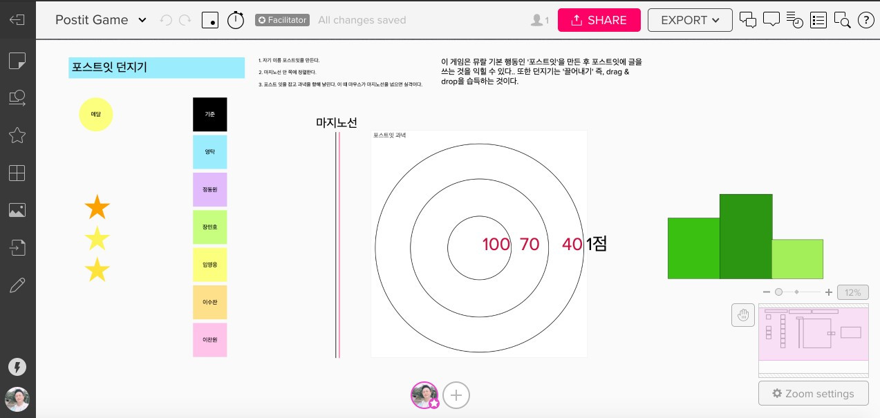 포스트잇 던지기 게임은 이런 맥락에 개발한 단순한 게임이다. 자기 이름이 적힌 포스트잇을 만들어 기준선에 정렬하고, 마우스로 포스트잇을 잡은 상태에서 과녁으로 획 던지면 그만이다. 이 과정은 ① 포스트잇을 만들고 ② 글을 쓰고 ③ 원하는 곳으로 이동하는 삼박자를 단번에 학습할 수 있다.