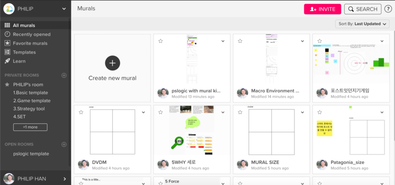 뮤랄 Room은 폴더와 같은 기능이다. 윈도우에서 새 폴더를 만들면 '직박구리'라는 이름을 얻는 것처럼, 뮤랄은 등록한 사용자 이름의 비밀의 방을 만들어 준다.