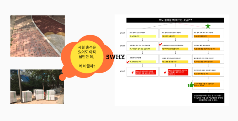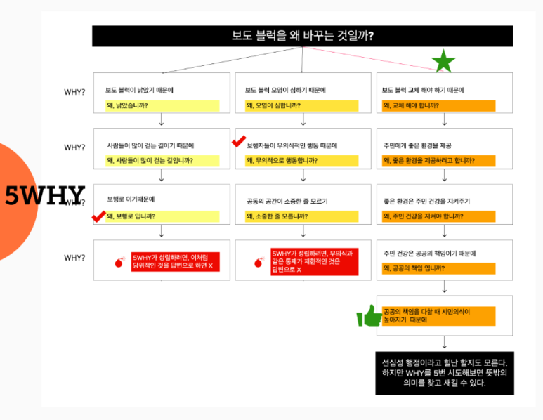 흔히 선심성 행정 대명사로 여겼던 '보도 블럭 까 뒤집기', 하지만 왜(WHY)를 5번 해 나가보니 이전에 알 수 없었던 뜻밖의 의미를 찾았다. '공공이 책임을 다할 때 시민의식이 높아진다'라는 결론이 그렇다. '보도 블럭'이 새롭게 보이는 순간이었다. 5WHY 일상속으로 들어가는 재미가 삼삼하다.