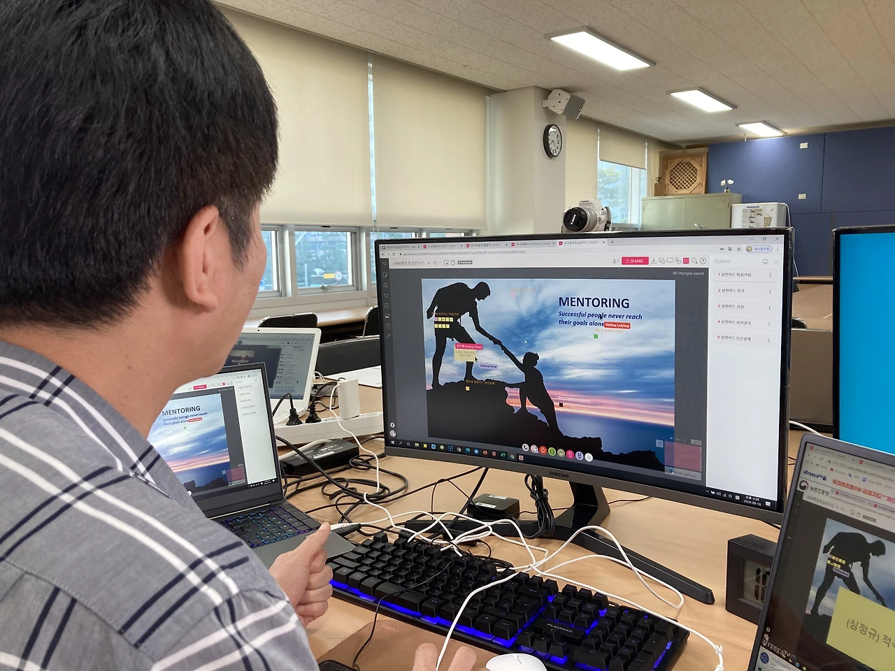 중간중간 작은 소동은 있었지만 뮤랄에 대한 호기심을 막진 못했다. 마지막 시간 ‘디지털 멘토링’ 과정 명 다운 하이라이트 화면을 띄웠다. 학습자분들은 신기하다는 말을 이어갔다. 포스트잇을 만든 후 자기 생각을 솔직하게 쓰기 시작했다. 악 조건 속 워크숍이 성황리에 마무리되어가자 그제서야 PD 얼굴에는 웃음기가 가득했다.