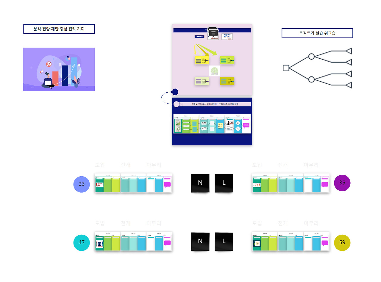 이 과정 핵심은 '분석' '전망' '제안' 이 3단계를 논리적으로 전개하는 방법을 익힌다. 이를 전개하는 방식은 첫째, 로직트리 Logic Tree 기술을 익히는 일이고 둘째, 논리 원칙인 MECE(Mutually Exclusive Collectively Exhaustive: 상호 배타적이고 부분의 합이 전체를 이룬다)를 개념을 실제적으로 적용하는 실습이다.