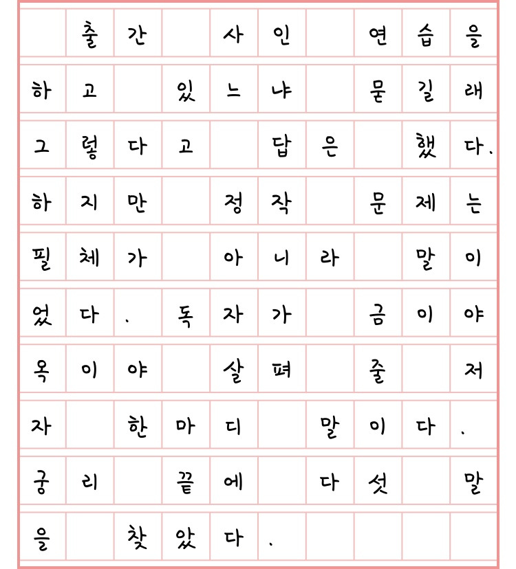 원고지 글에 쓴 사인 글이 테이블 위 책 좌측부터