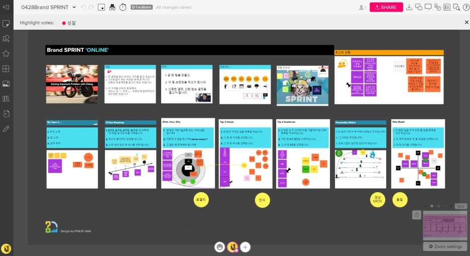 한데 이 브랜드 스프린트는 대면 워크숍 버전이다. 리모트 워크 시대에 결을 맞춘 프로그램이 필요해 보였다. 해서 뮤랄 · MURAL 캔버스에서 이를 재해석하고자 했고, 그 결과 탄생한 것이 '팀 브랜딩 스프린트 온라인'이다.