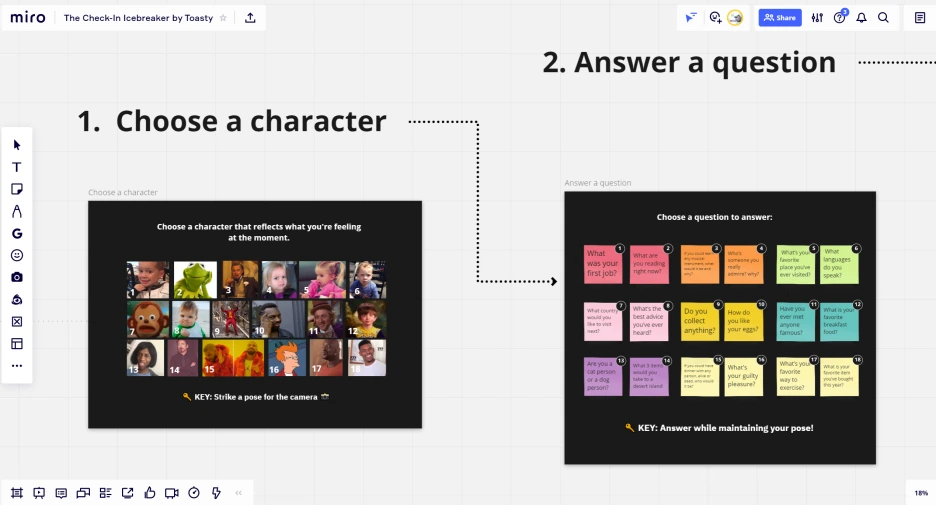 Toasty.ai는 비디오 플랫폼 서비스를 제공하는 스타트업이다. 최근 이 기업이 MIROVERSE 즉, 미로 보드를 활용한 템플릿을 공유하는 미로 내 플랫폼에 아이스 브레이크 용 템플릿 하나를 포스팅했다.