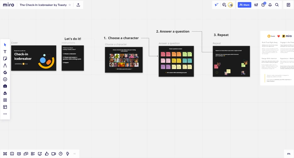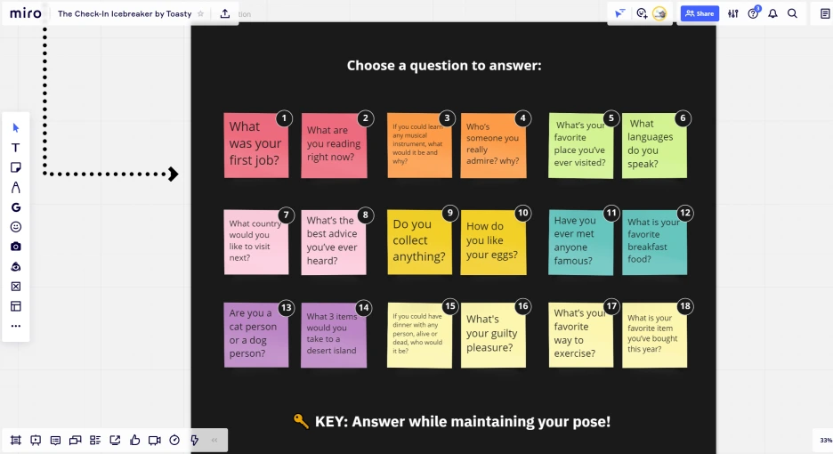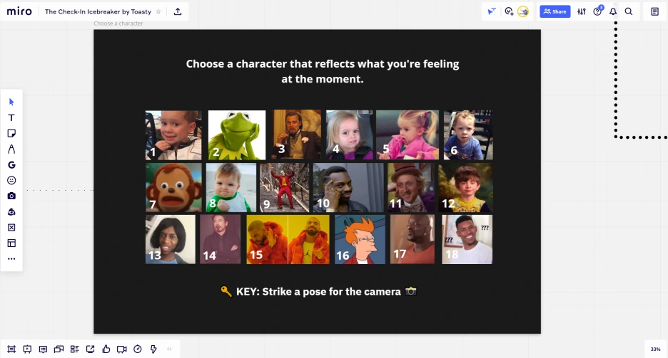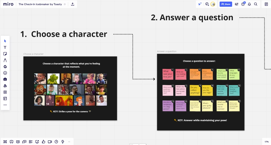 예를 들어 1번 캐릭터에 해당하는 질문은 '당신의 첫 번째 일은 무엇이었습니까?'이다. 이 방식을 회의 시작 전 또는 워크숍 온보딩 프로그램으로 또는 리플레쉬 용도로 쓰면 꽤 재밌겠다.