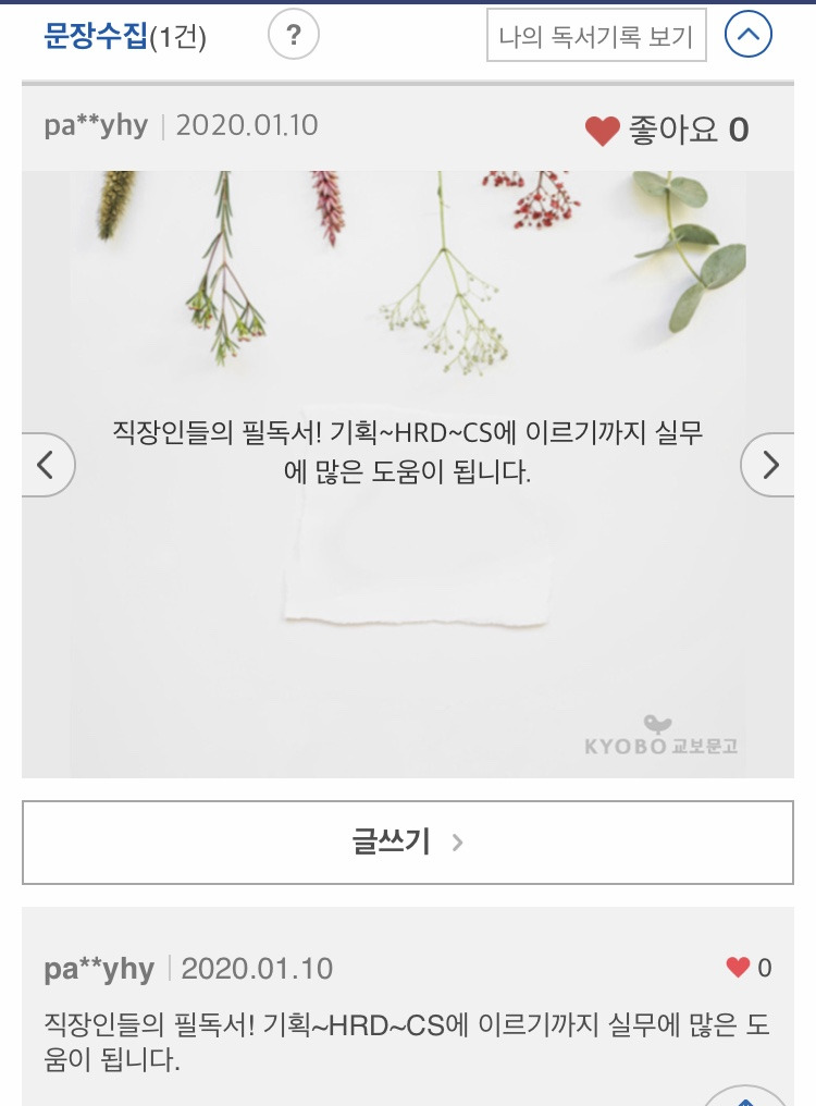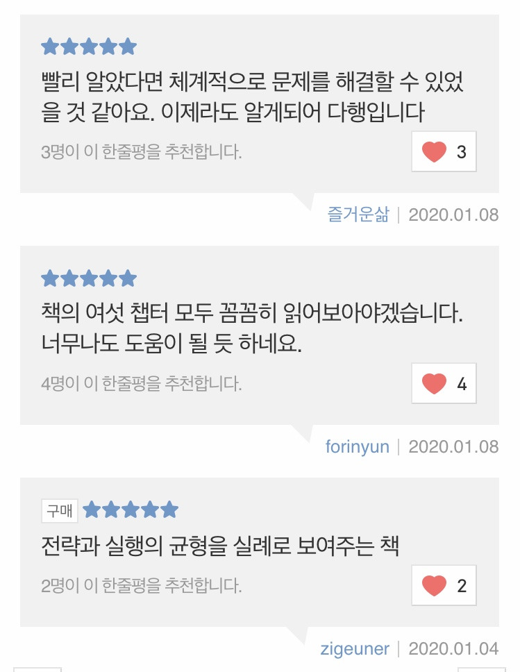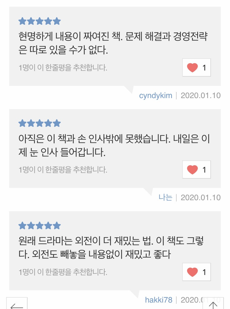 예스24를 둘러보는 중, 한 줄 평이 15개이다. 리뷰는 한 개. 교보문고는 ‘문장수첩’에 한 개 리뷰가 있다. 아, 참 이게 뭐라고 가슴이 콩알만해졌다. 하나씩 읽어내려가는 데 심장 박동이 어찌나 빨리 뛰던지 숨 막힐뻔 했다. 다행히, 정말 다행인 일은 뒷목 잡고 쓰러질만한 평은 없었다. 문장수집에 평을 쓴 아이디는 낯설지 않은데, 예스24 한 줄평을 쓴 분들은 감조차 잡을 수 없을만큼 누군인지 모르겠다.