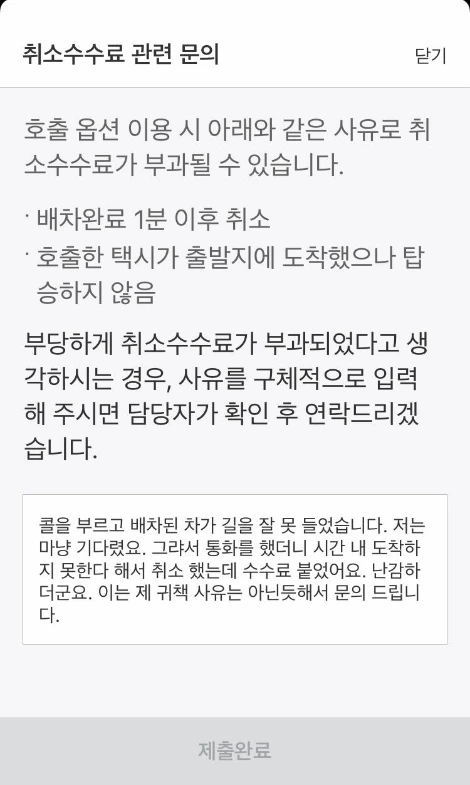 설마 사정이 어찌 됐든 간에 배차 취소는 고객이 했으니 수수료는 받아야 한다는 것이 비즈니스 모델인 것일까. 아니면 곧 상장을 앞둔 상태여서 수단과 방법을 가리지 않고 단기간 매출을 급등 시켜야 하는 안면 수심 뻔뻔함을 장착한 탓일까.