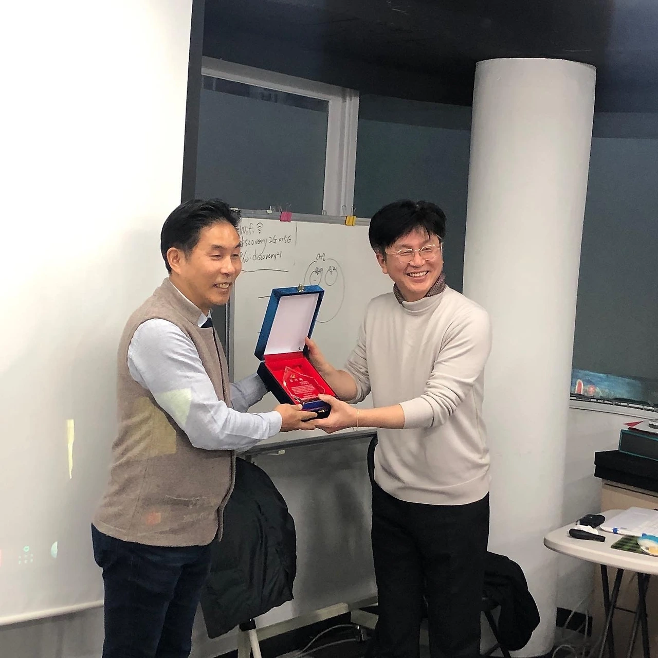 <좌: 김윤석 대표, 우: 본인>올해로 15년 째를 맞이하는 모임이라는 김윤석 대표 인사말로 ‘스페셜 정모’를 시작했다. 네시간 후 김 대표께서는 뜻밖의 ‘감사패’를 안겨 주셨다. 귀한 정기 모임 자리를 선뜻 내 주신 것도 황송한 일인데, 감사패 까지. 지난 북콘서트(1. 9.목) 때, 월간플랜비(1. 15. 수) 때에도 받은 ‘호사’의 끝판왕이 아닐 수 없다. 정말 이런 호사가 따로 없다. 더욱 열심히 착하게 살아야겠다.