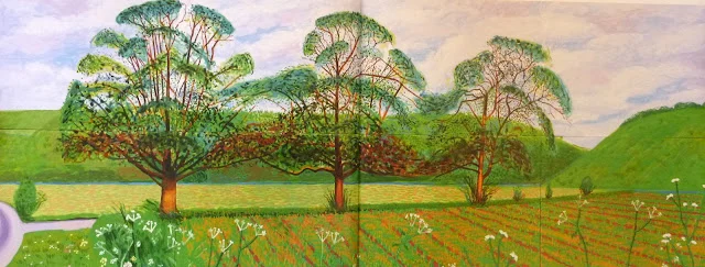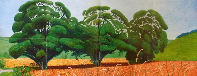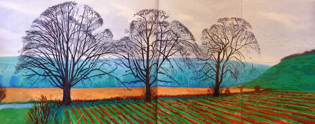 브리드링톤에서 서쪽으로 약 11km 떨어진 킬햄까지 도로가 Woldgate이다. 이번에 호크니는 동쪽으로 길을 잡았고, Thixendale 근처에서 세 그루 나무에 이르렀다. 사이좋게 어깨동무하듯 서 있는 모습이 호크니 시선을 사로잡았다. 2007년 · 2008년 두 해에 걸쳐 Three Trees in Thixendale이라는 제목으로 사계절을 담았다. 흥미로운 점은 2007년은 여름과 겨울, 2008년은 봄과 가을이다. 마치 한 계절을 넉넉히 즐기면서 가장 그림다운 한 때를 기다린 듯싶었다. 하지만 이 작품은 캔버스(91.44 x 162.56 cm) 8개를 붙여 완성한 대작이어서 한 계절을 족히 써야지만 했다. 실물 크기를 20배 축소한 이미지 사진에도 흥분이 잦아들지 않고 있다. 한데 실제로 이 작품이 내 눈앞에 펼쳐 있다고 상상하면 EMP 충격파를 맞은 몸이 되고 말 것이다. 1900년 초 수련 연작은 캔버스에 갇힌 회화의 혁신을 이뤘다. 그로부터 100여 년 동안 누구도 수련 연작에 대적할 만한 작품은 없었다. 마침내 2011년 호크니가 관념에 사로잡힌 현대 회화를 캔버스 밖으로 끌어내는 기염을 토했다. 가디언 지는 이런 호크니의 패기에 감전된 신예 작가들이 앞으로 계속 나올 것이라는 호평은 이 작품을 감상하는 포인트치곤 간지럽다. 이 작품이 남긴 회화 업적은 호크니의 말에서 찾을 수 있다. '열심히 무언가를 보는 것에 그치지 말고, 실제 보고 있는 것을 생각하라'는 이 말은 호크니가 이 연작을 시작한 계기일 뿐만 아니라 이 작품을 단순한 대작으로 기억되는 것을 경계한 말처럼 느꼈다. 그래서 더더욱 이 작품 앞에서 내가 보고 있는 것이 진정 무엇인지 보고 싶다. 나는 지금 무엇을 보고 살고 있는지도 알고 싶다.