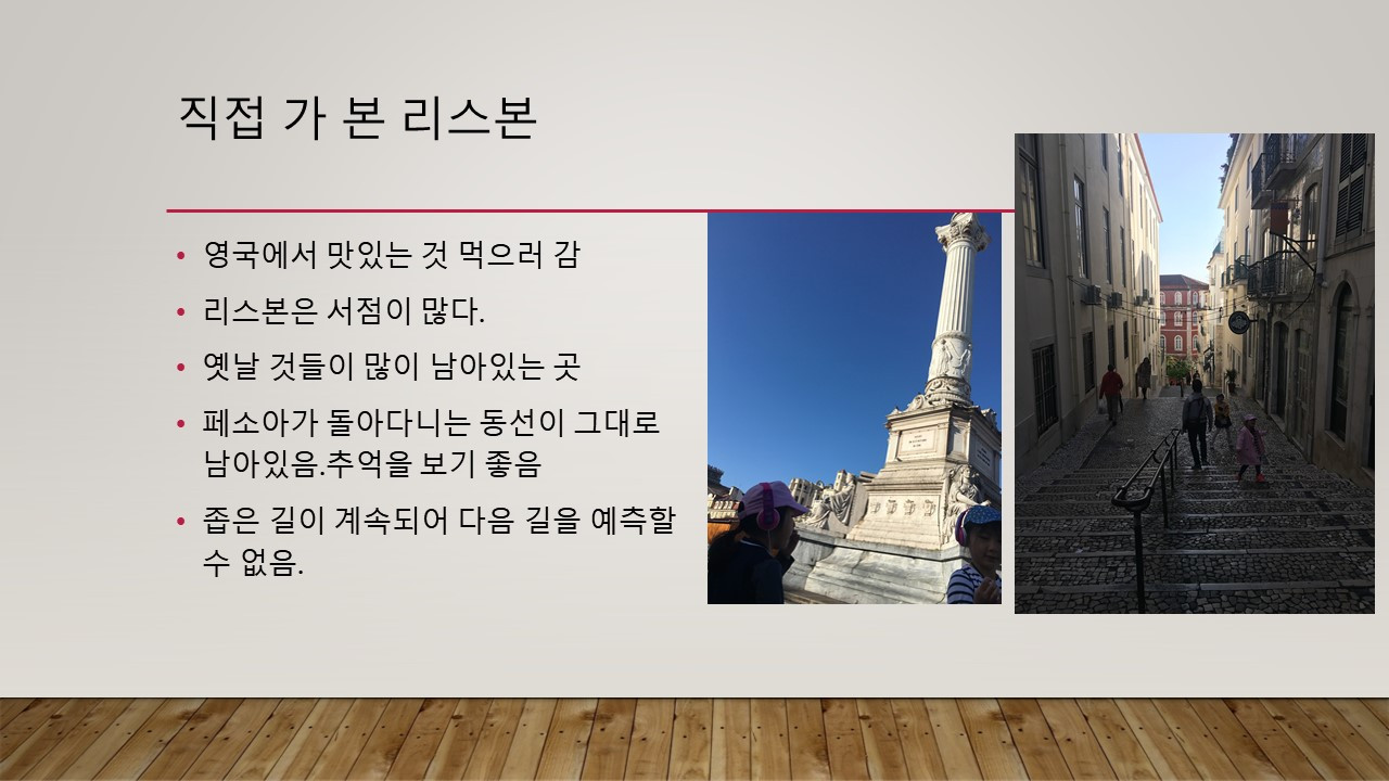 리스본에 다녀왔었다. 내가 원해서 간 건 아니고 남편이 포르투갈에 가면 맛있는 음식이 가득하다는 주변 정보를 듣고 서다. 영국 음식은 정말 그걸 먹고 사는 사람이 용한 수준이다. (정확하게 살기 위해 먹는다는 걸 제대로 알려준다고할까?) 포르투갈은 이베리아반도에 스페인과 나란히 있음에도 신기하게, 아니 너무 당연하게 둘 사이는 아주 나쁘다. 포르투갈은 브라질을 식민지로 두어 포르투갈 인구 대부분이 거기로 갔는지 인구가 많이 없었다. 포르투갈 사람보다 관광 온 영국인이 더 많은 것 같다. 포르투갈의 옛날 수도였던 포르투를 시작으로 리스본을 찍고 코임브라를 본 후 가장 밑에 남편이 원래 가고 싶어했던 해변으로 가는 포르투갈 일주를 했다. 기적이 일어났다는 파티마를 보고 싶었는데 고속도로에 나오는 이정표를 보고 만족해야만 했다. 애 셋을 끌고 그 정도면 아주 열심히 다닌 거다.