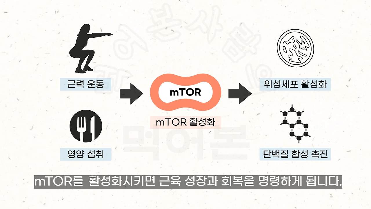 근섬유에 대해 공부할 때 근수축 기전을 공부하며 액틴과 미오신 필라멘트에 대해서 많이 접하게 됩니다. 이 단백질 필라멘트 (딱딱한 선 형태)는 근육세포핵 (nucleus)에서 만들어 준답니다. 인간은 살아있는 동안 끊임없이 근육 섬유 (액틴과 미오신 필라멘트)가 찢어지지만 핵에서는 늘 새로운 근섬유를 만들어내고 있답니다. 이때 운동을 하면 mTOR (mammalian target of rapamycin)라는 중요한 단백질이 활성화됩니다. 운동을 할 때 근육을 크게 만들어주는 가장 중요한 친구입니다. 근력강화 운동을 왜 합니까??라고 저에게 묻는다면 mTOR를 활성화시키려고 합니다.라고 대답할 정도로 아주 핵심적인 물질이랍니다.