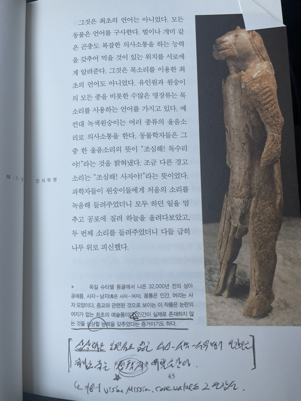 5. "조심해! 저기 사자가 있어!"라고 말할 수 있는 것은 녹색원숭이도 가능하다고 한다. 그러나 "사자는 우리 종족의 수호령이다."라고 말할 수 있는 것은 오직 사피엔스만이 구사하는 언어의 특질이다.