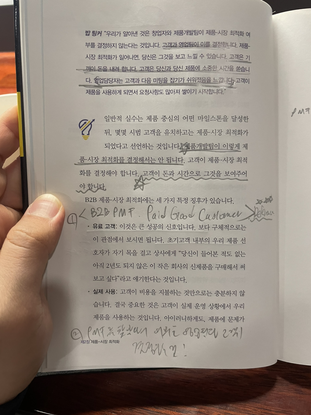 돈을 내고 쓰는 고객사들이 생기는 모든 팀들, 축하드립니다! 그리고 진심으로 응원합니다! 이제 현실로 돌아와 고객들이 잘 쓰고 있는지, 우리 제품을 동네방네 소문내는지, 많은 문의와 개선사항들이 들어오는지까지 함께 고려하며, 더 확실하게 PMF를 찾았다는 징후를 발견하시길 바랍니다. 그때부터가 진짜이니까요.