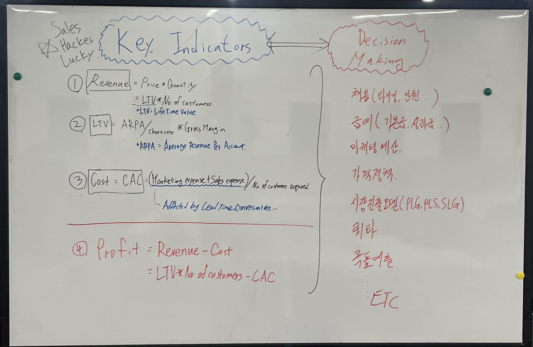 -이 모든 지표들이 채용 인원 및 타이밍, 급여 수준, 마케팅 예산, 가격 정책 , 시장진출모델(영업주도성장 또는 제품주도성장), 쿼타 분배, 목표 매출 등의 의사 결정과 상호 영향을 주고 받습니다.